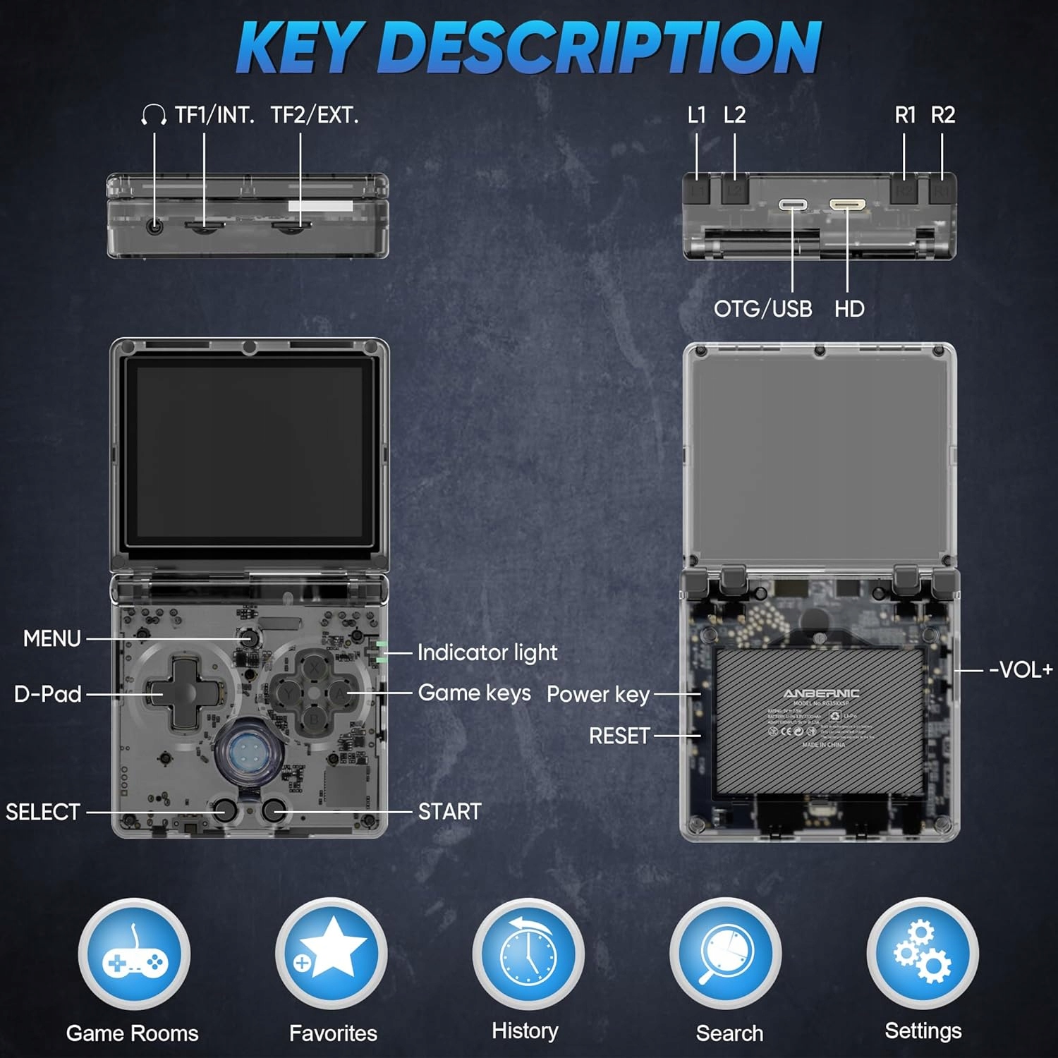 - 3,5-дюймовий складаний IPS-екран із повним кутом огляду, повна підгонка OCA /640*480, дисплей дуже чітко. Загартоване скло, подвійний захист від подряпин і падінь, принесе вам захоплюючий досвід гри та краще захищає ваші очі
