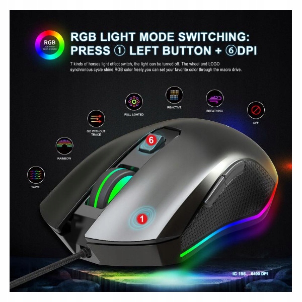 Миша має вбудований оптичний датчик, який швидко реагує на рух і гарантує плавну гру. Ви можете регулювати чутливість миші в діапазоні1200-2400-4800-6400 DPIщо забезпечить вам надзвичайну швидкість і точність знімків. Ви можете легко налаштувати мишу відповідно до своїх потреб і гарантувати точну якість гри, яку ви хочете.