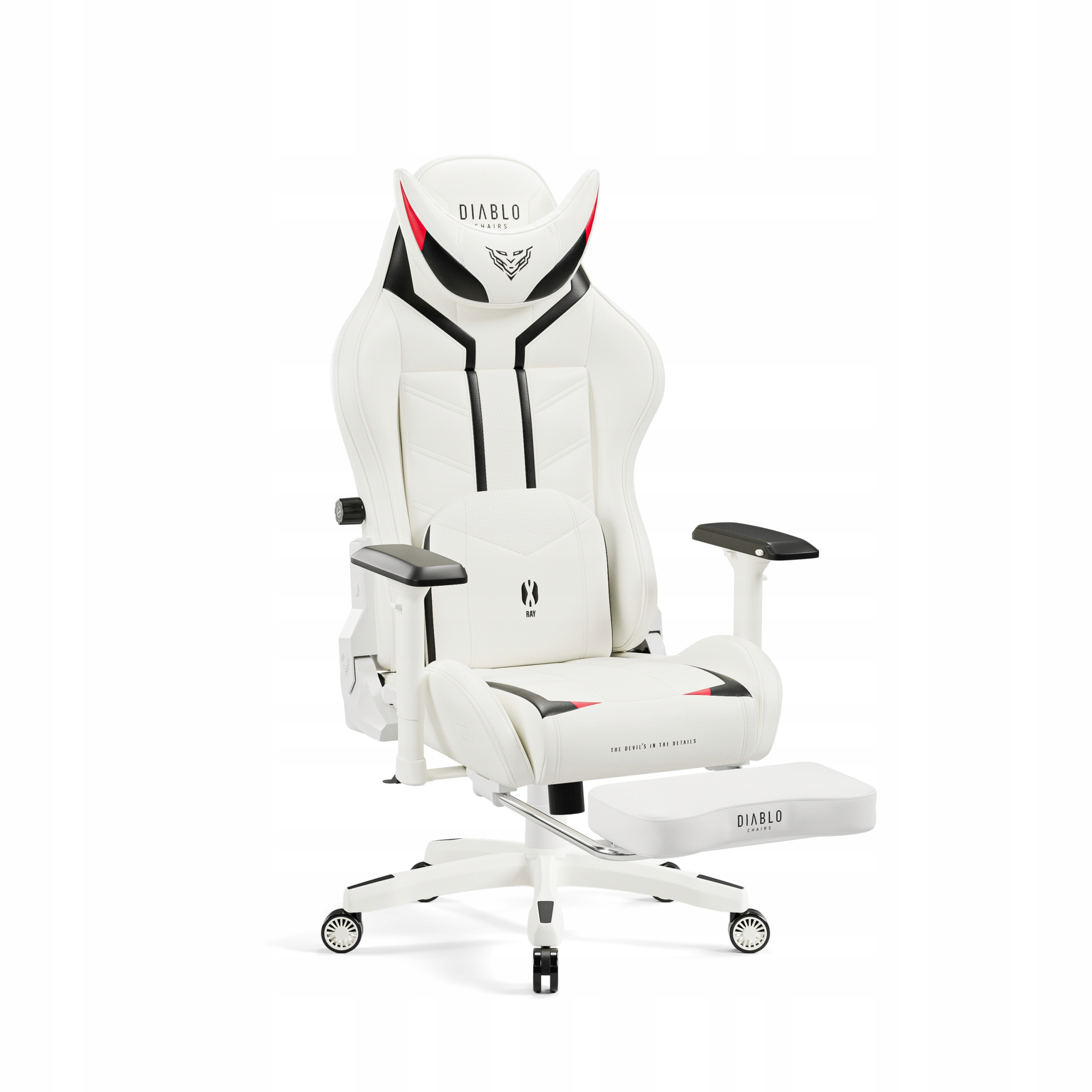 Diablo X-Ray 2.0 у стилі третього покоління справляє величезне враження. Це пояснюється надзвичайно оригінальними кольорами. Біле геймерське крісло з чорно-червоними аксесуарами - справжня візуальна унікальність, яка ніколи не набридне. Все це доповнюється ретельно вишитими деталями.