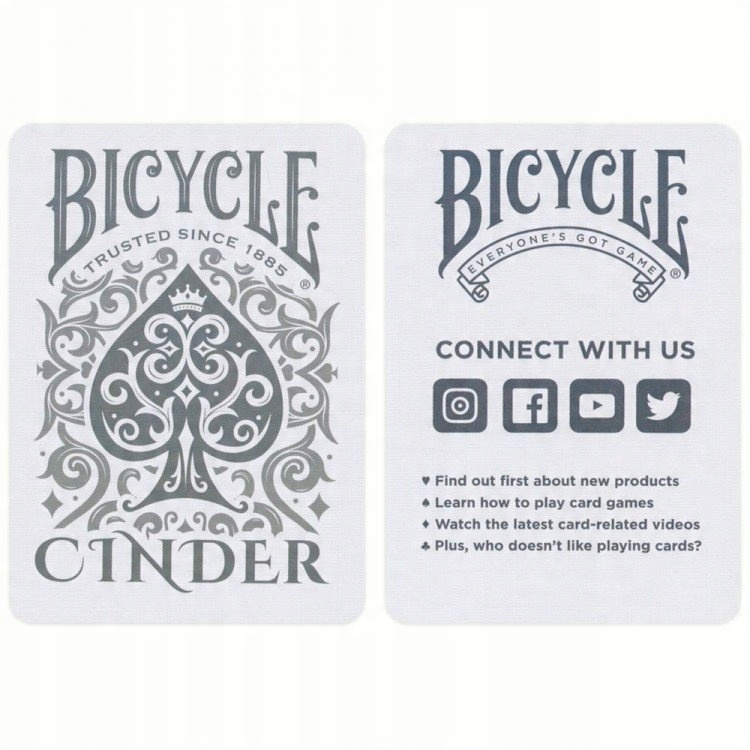 Bicycle Cinder натхненний елегантним та таємничим клубом диму, який піднімається над тліючими вогнями. Дизайн закладки представлений різними відтінками попелясто-сірого кольору та має блискучу сріблясту фольгу з двома рівнями тиснення для 3D-ефекту. Також містить індивідуальну запірну пломбу. Відкриття вкладки відкриває блискучий сюрприз. Внутрішня частина згину надрукована теплими золотистими кольорами, що представляють розжарене вугілля з димом, що піднімається від нього.