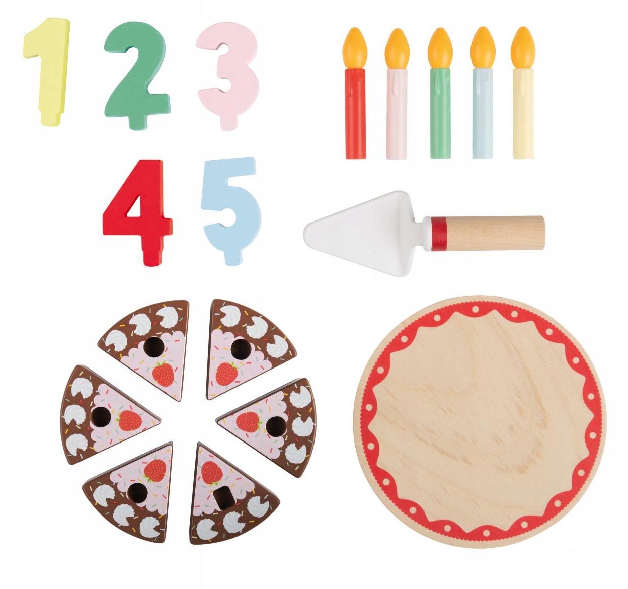 святковий торт до дня народження з пластиковою серветкою з дерев'яною ручкою, 5 пластикових свічок і цифрами від 1 до 5