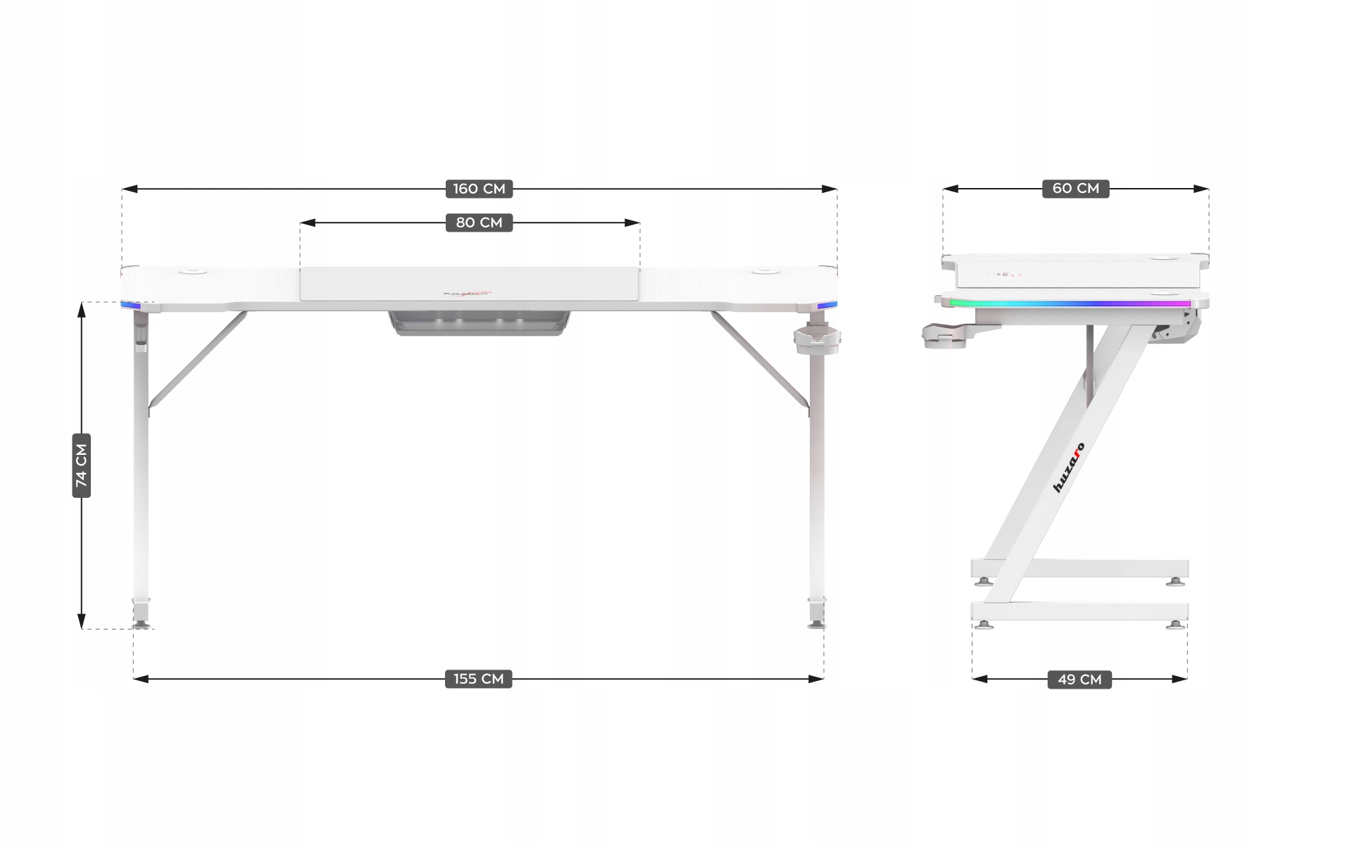 Не дозволяйте вашому столу бути лише нудними меблями. Світлодіодне освітлення RGB перетворить вашу роботу та розваги на натхненний оазис творчості. Завдяки багатьом кольоровим режимам ви створите атмосферу відповідно до вашого настрою, і верхній верх 160 см задовольнить усі ваші потреби. Комфорт використання столу буде збільшуватися за допомогою килима XXL, кабельної маски та отворів для навушників та кружки.
