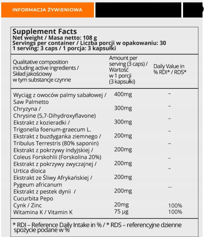 екстракт трибулуса террестріса (Tribulus Terrestris) 80% сапонінів, екстракт плодів пальметто, хризин (5,7-дигідроксифлавон), екстракт пажитника (Trigonella) foenum - graecum L.), екстракт індійської кропиви (Coleus Forskohli) - форсколін (20% форсколіну), екстракт кропиви звичайної (Urtica Dioica), екстракт африканської сливи (Pygeum africanum), глюконат цинку, вітамін К (фітоменадіон), засіб проти злежування речовини: стеарат магнію, оболонка капсули (желатин, барвник E171).