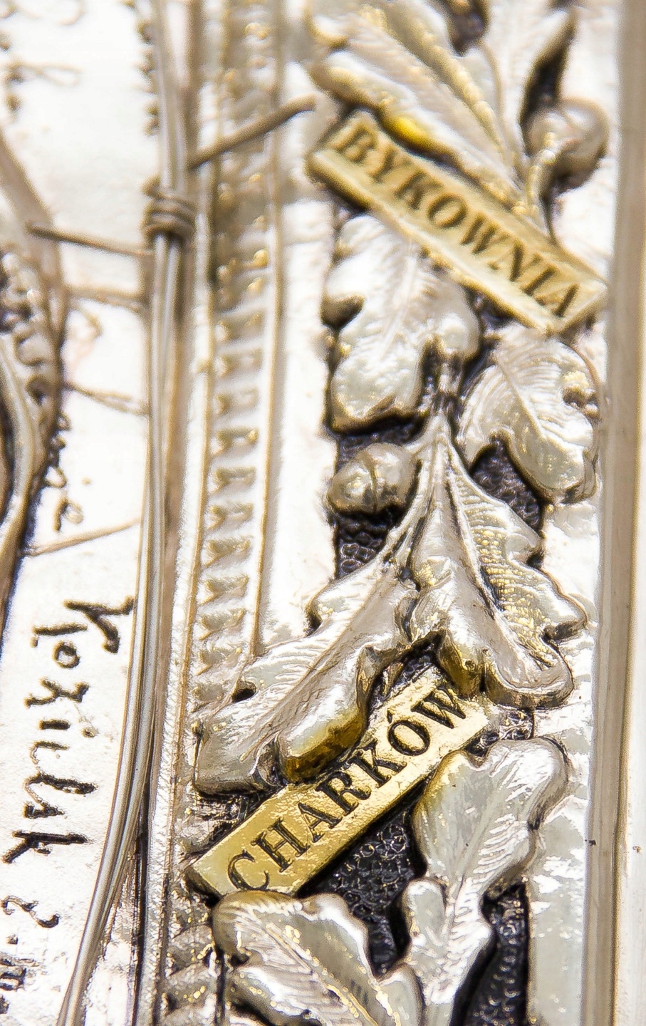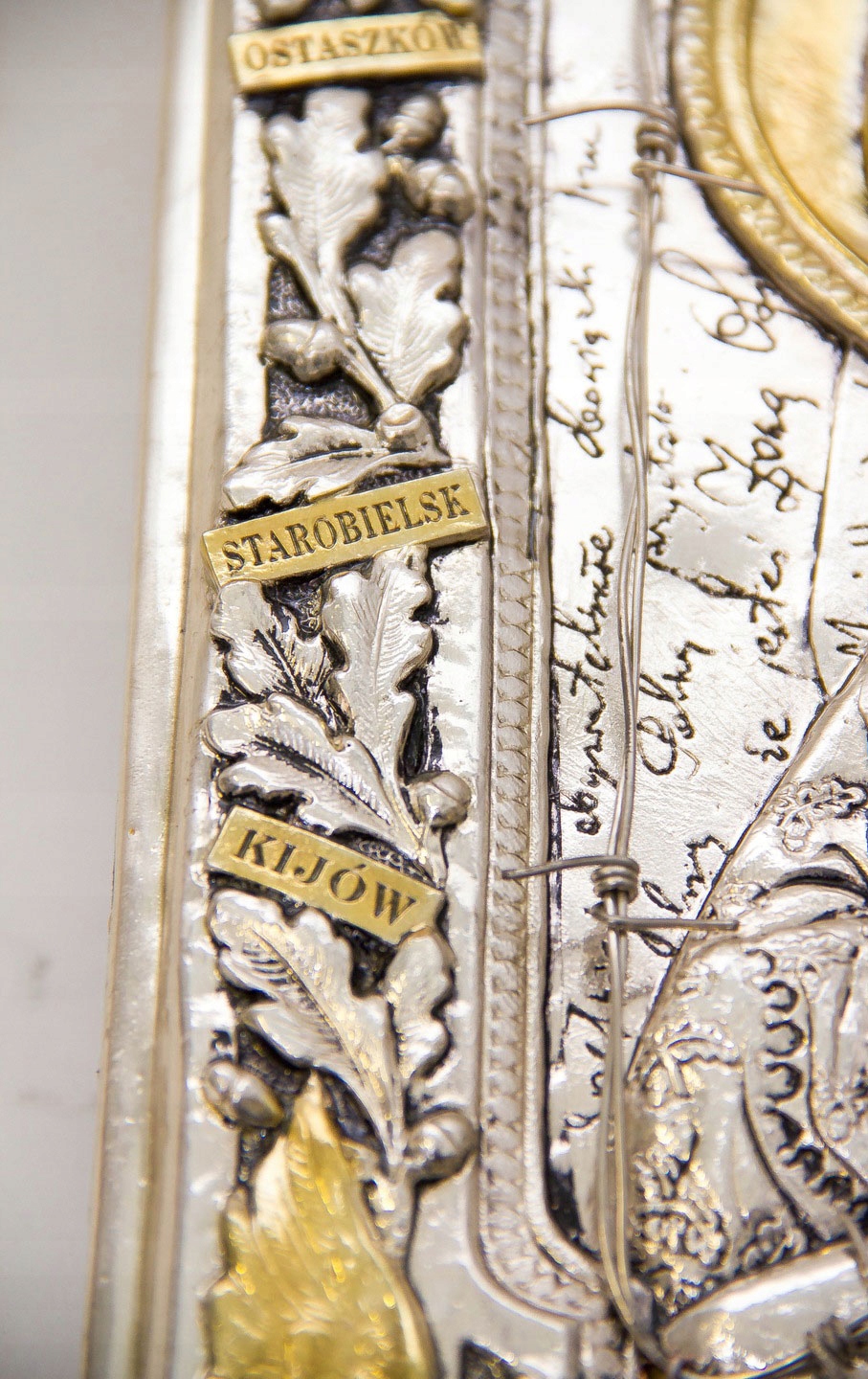На кутах увінчаний позолочений орел. Дизайн центральної частини металевої футболки базується на оригінальній іконі, виконаній на дерев’яній дошці в Козельському таборі поручиком Генріком Гожеховським 28 лютого 1940 року. Додані додаткові елементи підкреслюють символічність вистави.