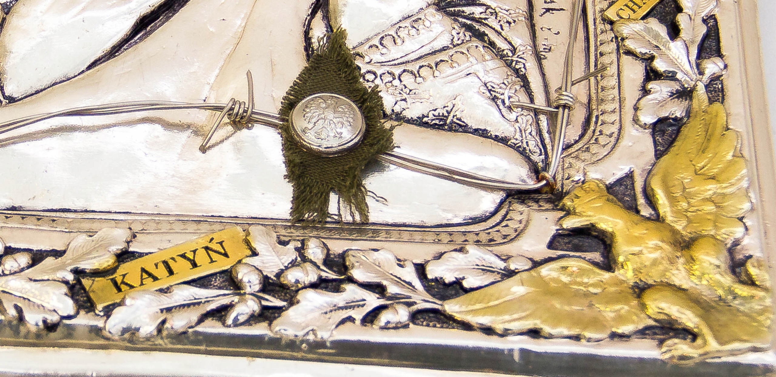Також ми знаходимо уривки відсканованих оригіналів Катинських листів, розміщених як фон, а також фрагмент польського офіцера уніформи з окремим військовим. кнопку.
