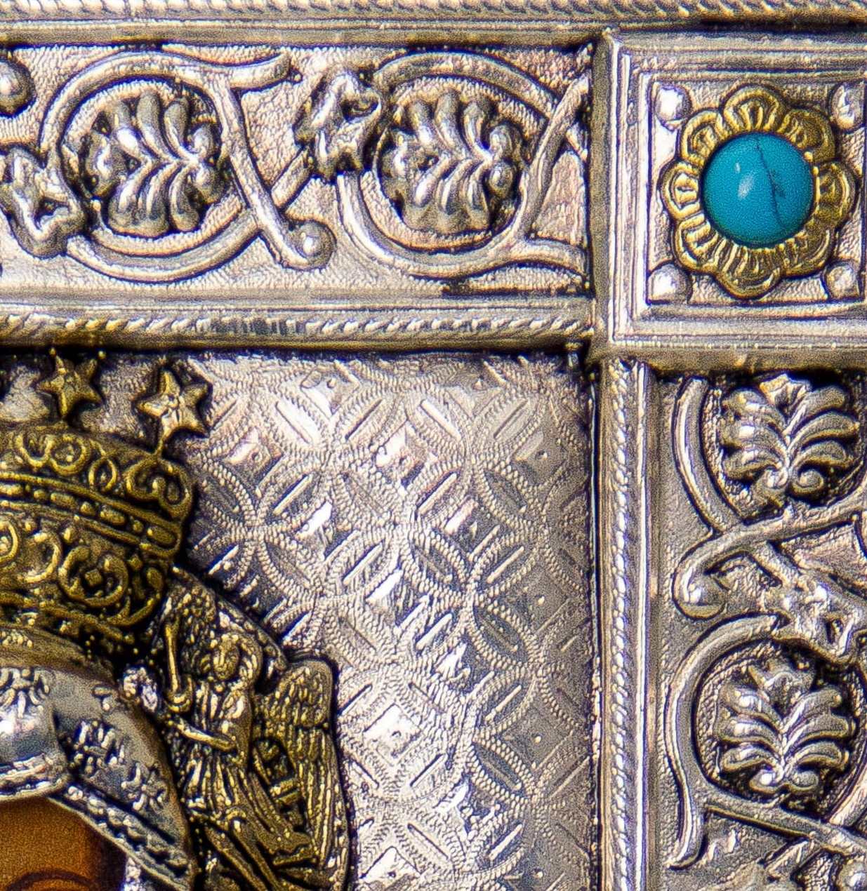 Виготовлено з посрібленого та позолоченого 24-каратного золотамідь. Усе хімічно зістарене та поліроване до бажаного ефекту. Металева поверхня остаточно покривається прозорим лаком, який є відмінним захистом від знебарвлення срібла та пилу тощо. Ручний розпис. Лазерна олія на акриловій основі. Глазурний шар надає картині глибини та враження «старості», водночас є захисним шаром для картини.
