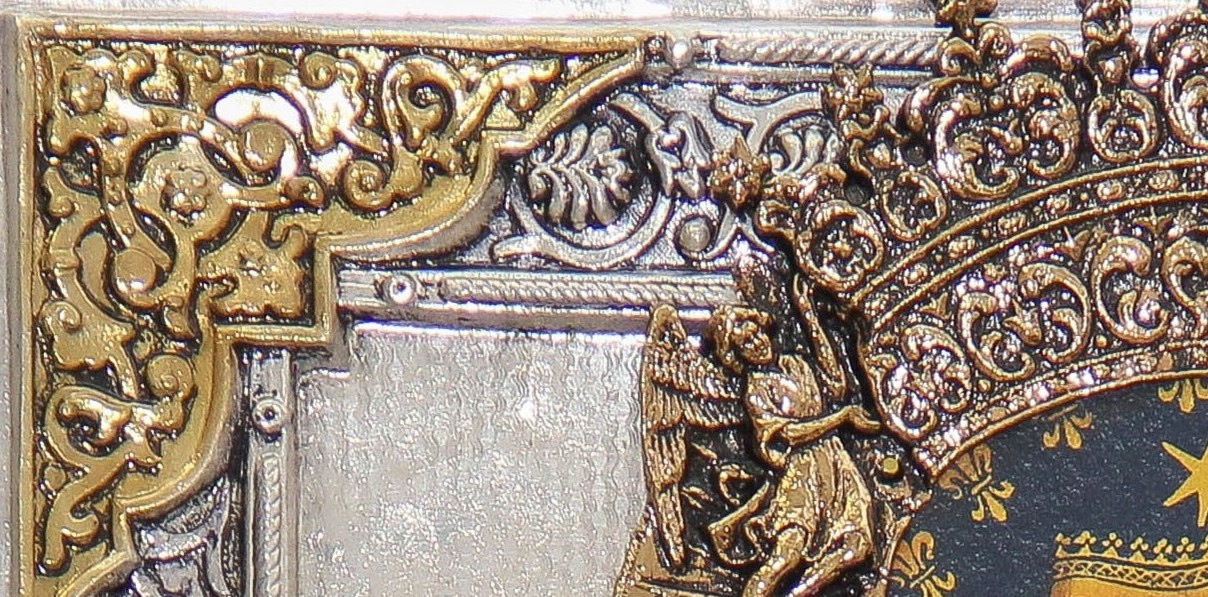 Виготовлено з посрібленого та позолоченого 24-каратного золота, міді. Усе хімічно зістарене та поліроване до бажаного ефекту. Металева поверхня остаточно покривається прозорим лаком, який є відмінним захистом від зміни кольору срібла та пилу тощо. Ручний розпис. Лазерне масло на акриловій основі. Глазурний шар надає картині глибину і враження «старості», водночас є захисним шаром картини. Акрилова основа є чудовою кольоровою основою для проявлення та обробки олійними фарбами. Все кріпиться на дошці, оббитій натуральним бавовняним оксамитом.