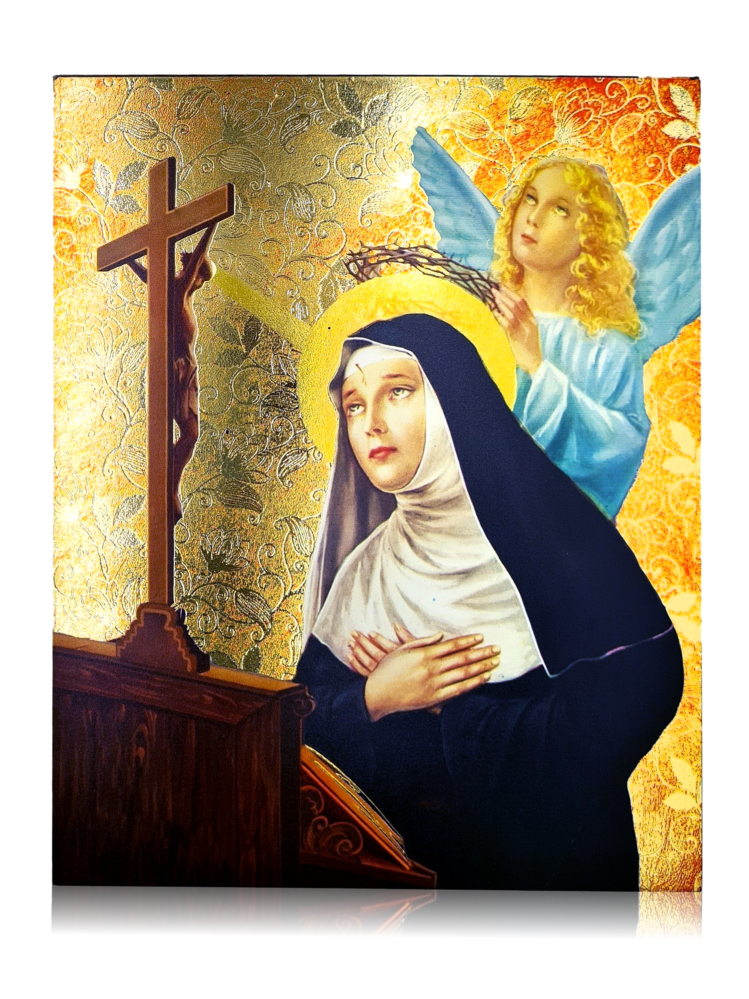 Справжня зірка серед святих Господніх. За легендою, Сам Бог подарував їй троянди посеред зими. Дружина дуже запального чоловіка Пола Манчіні та мати ще більш буйних синів Якоба та Павла. Після їхньої трагічної загибелі вона хотіла вступити до монастиря августинців – їй це вдалося лише з другого разу, і, за переказами, її заніс туди св. Августин та Іван Хреститель. Свята Ріта так сильно просила Бога розділити її страждання, що Він поклав їй на чоло шип із тернового вінка. Болюча рана на чолі супроводжувала святу Риту до самої смерті. Віримо, що ця ікона нагадуватиме Вам, що у важких і зовсім безнадійних справах Ви маєте свого Заступника перед Богом.