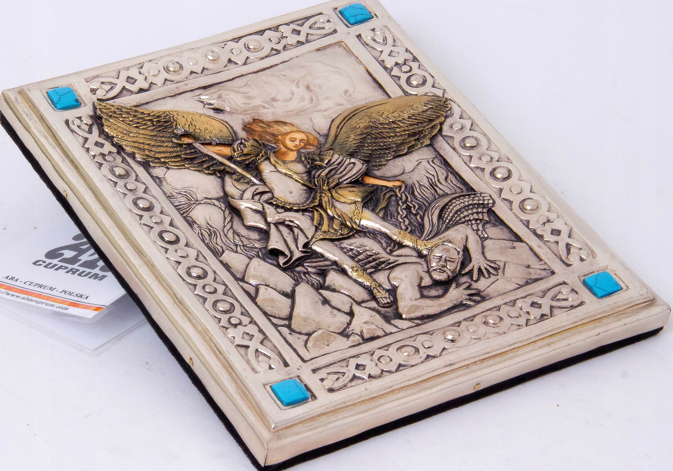 Оригінальний твір, натхненний найпопулярнішим зображенням архангела Михаїла, який приборкує сатану. Штамп GMERK (колишня торгова марка) на металевій кришці.