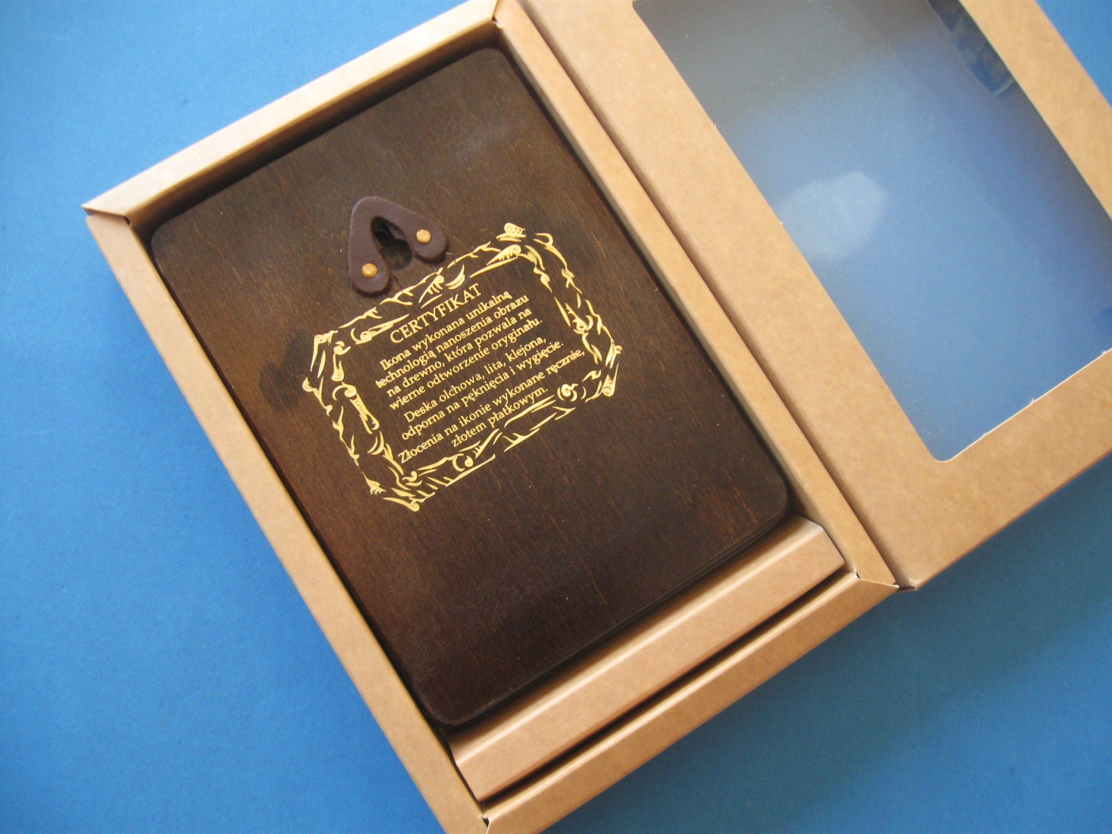 Польський продукт (вироблено в Польщі, всі матеріали для виготовлення походять з Польщі) Кожна ікона упакований в елегантну коробку з прозорою кришкою.