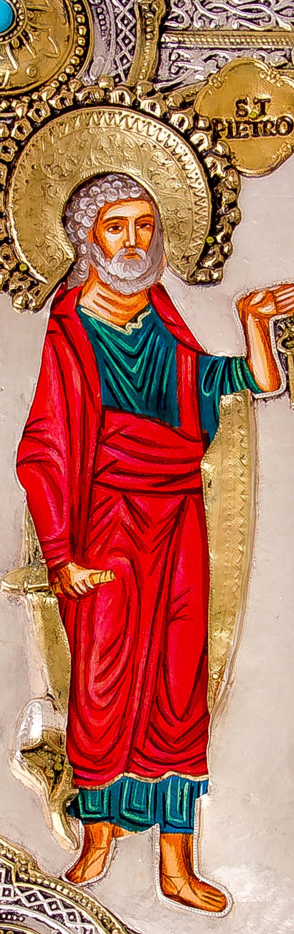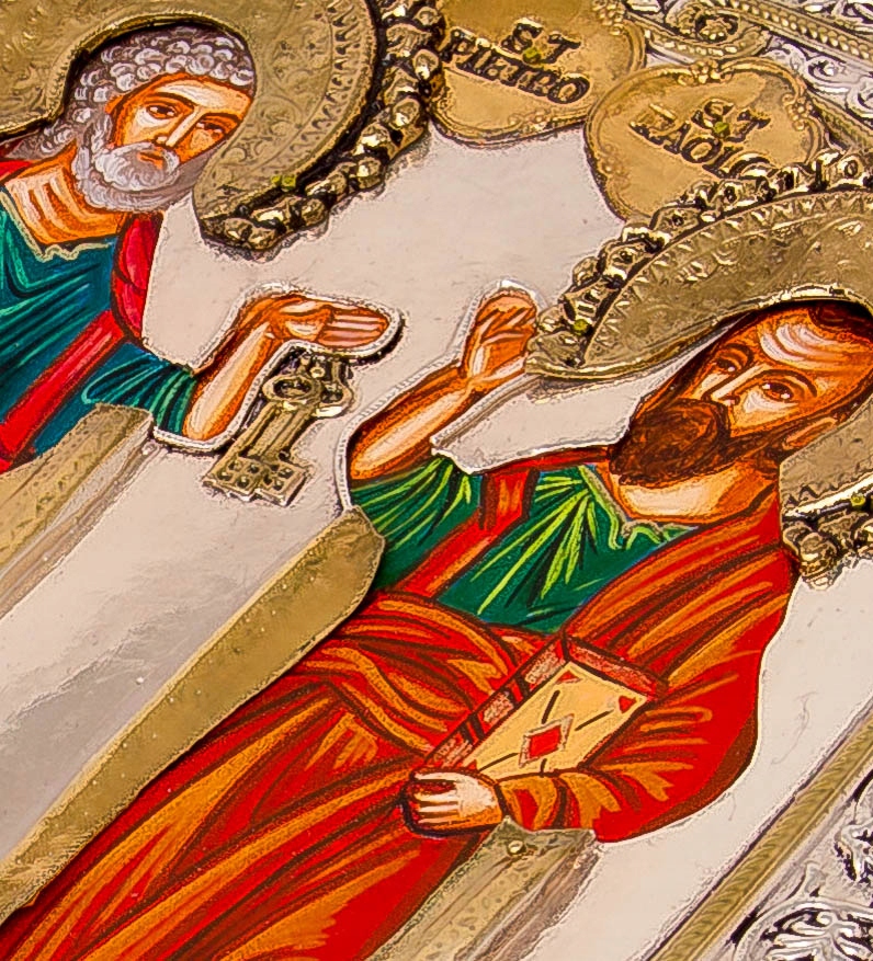 Ікона заснована на картині Ель Греко з 15 століття. З лівого боку він помістив св. Петро. У нього сумний, задумливий погляд, похилені плечі, бліде обличчя з сивою бородою. Все це вказує на його скромність, доброту, м'якість і нестійкий характер. З правого боку стоїть св. Павел, одягнений у червоне, кричуще та просторе пальто. У лівій руці Петро тримає ключі від Раю, правою рукою Павло показує на них, схвалюючи вибір Христа і водночас лівою рукою вказує на розгорнуту книгу