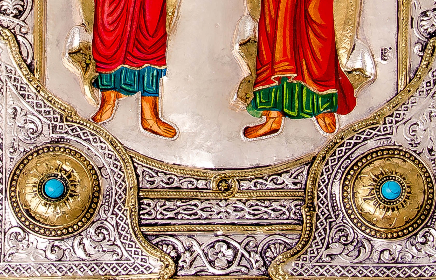 Виготовлено з посрібленого та позолоченого 24-каратного золотаміді. Усе хімічно зістарене та поліроване до бажаного ефекту. Металева поверхня остаточно покривається прозорим лаком, який є відмінним захистом від знебарвлення срібла та пилу тощо. Ручний розпис. Розписані цілі фігури святих. Лазерна олія на акриловій основі. Глазурний шар надає малюнку глибину і враження «старості», водночас він є захисним шаром розпису. Акрилова основа є чудовою кольоровою основою для проявлення та обробки олійними фарбами. Вся річ закріплена на дошці, оббитій натуральним бавовняним оксамитом.