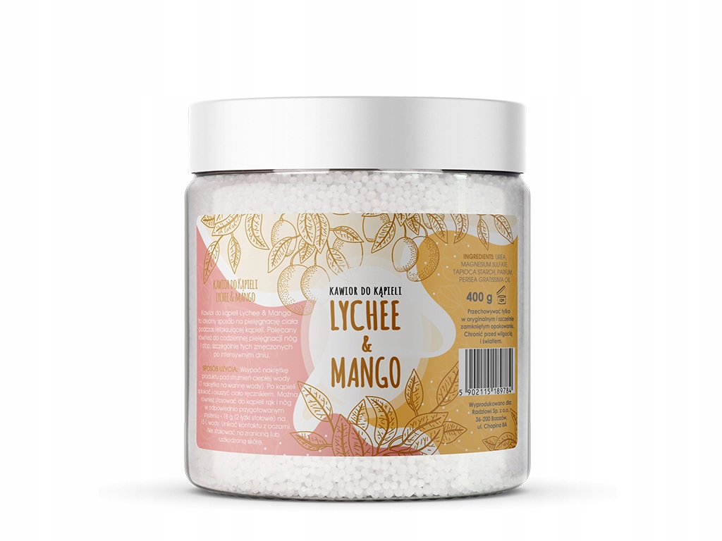 Пом'якшувальна ікра для ванн з лічі та манго - ідеальний спосіб догляду за вашим тілом під час розслаблюючої ванни. Сечовина пом'якшує шкіру і захищає її від втрати води, а також допомагає боротися з ороговінням епідермісу. Також рекомендується для щоденного догляду за ногами та стопами, особливо за втомленими після напруженого дня.