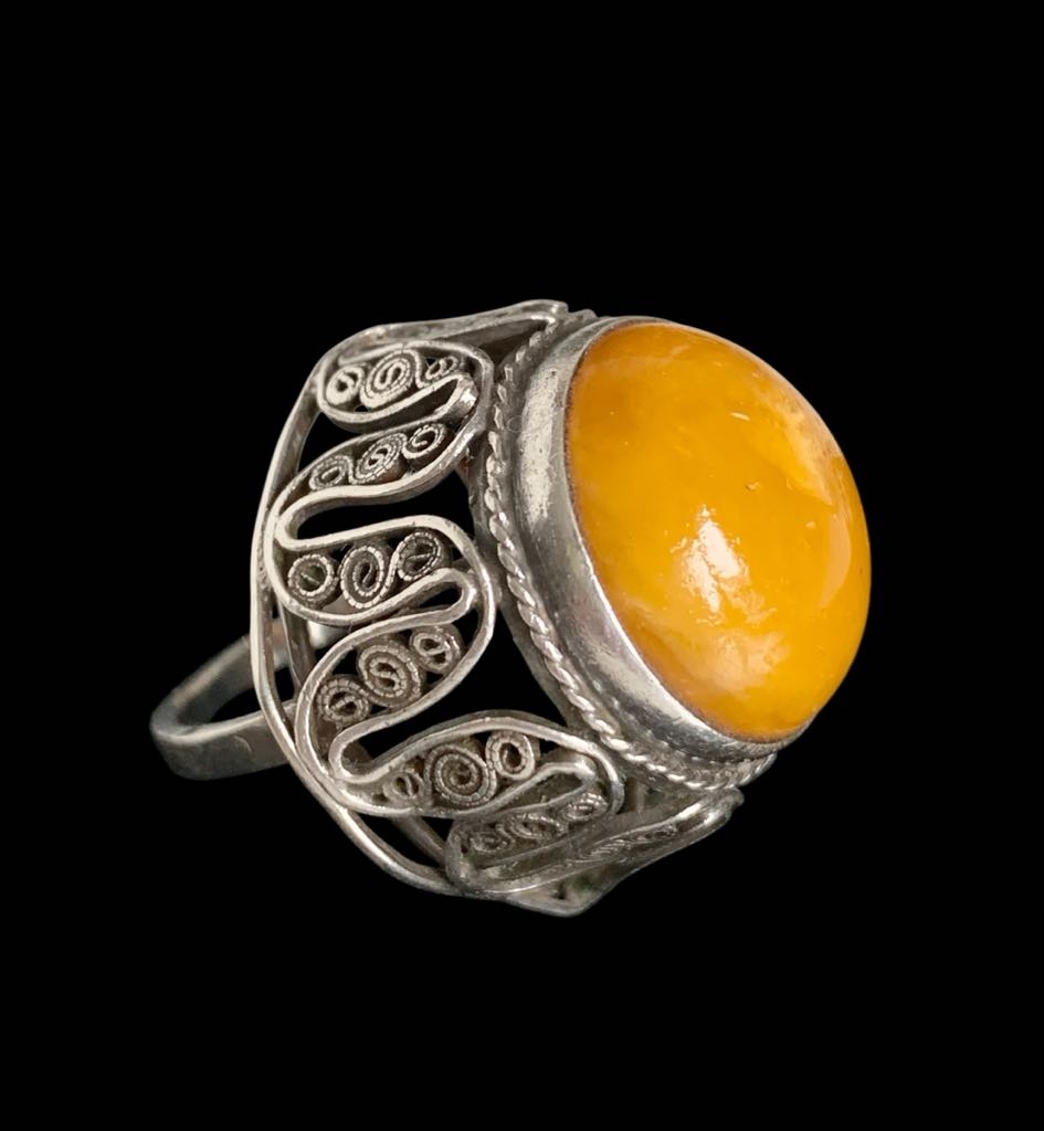 Срібне кільце з бурштиновим або пресованим бурштином.