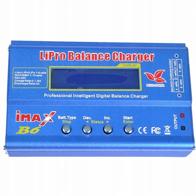 Мікропроцесорний зарядний пристрій IMAX B6 підтримує всі типи батарей, що використовуються в моделюванні: Ni-Cd, NiMh, Li-Po, Lilo, Li-Fe, Pb. Має вбудований балансир 2-6S для корпусів Li-xx з роз’ємами JST-XH. РК-дисплей з підсвічуванням.