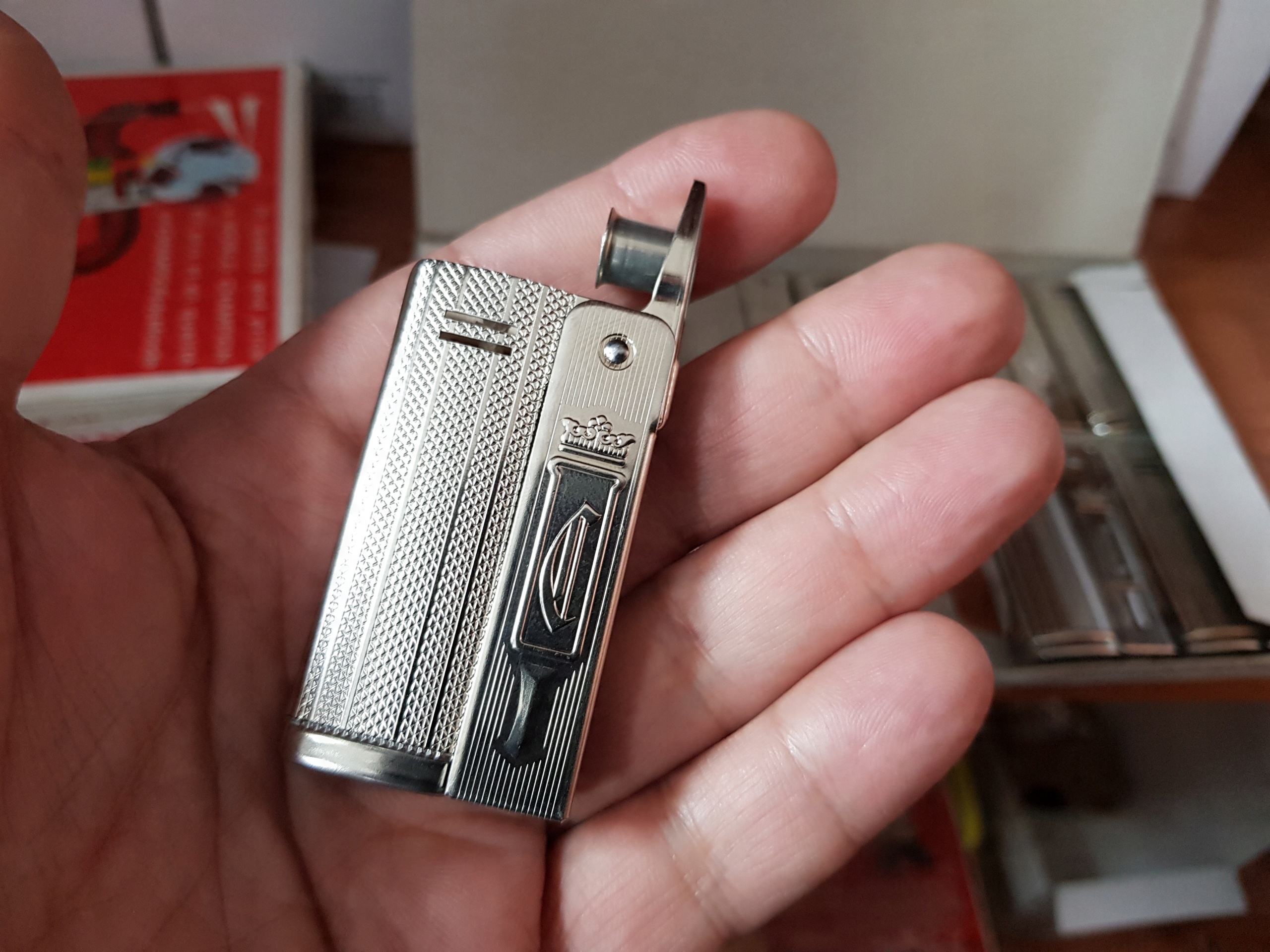 Більш легше запускається одним ходом, натиснувши "капот" запальнички. Відкриття викликає обертання Тіндера і одночасно іскриться до іскри, просоченої гнітом, і запалювання, пов’язане з нею. Перевага рішення полягає в тому, що користувач не безпосередньо торкається Tinder, що може спричинити бруд.