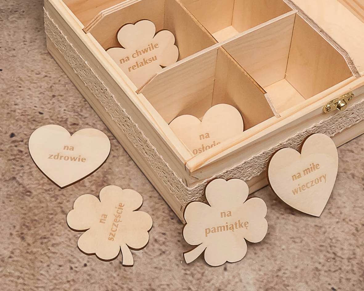 Дерев'яна скринька з оригінальним персоналізованим гравіюванням, побажаннями всередині, прикрашена червоними сердечками та декоративним мереживом (вибирається випадковим чином), закривається елегантною застібка золотого кольору, 6 відділень.