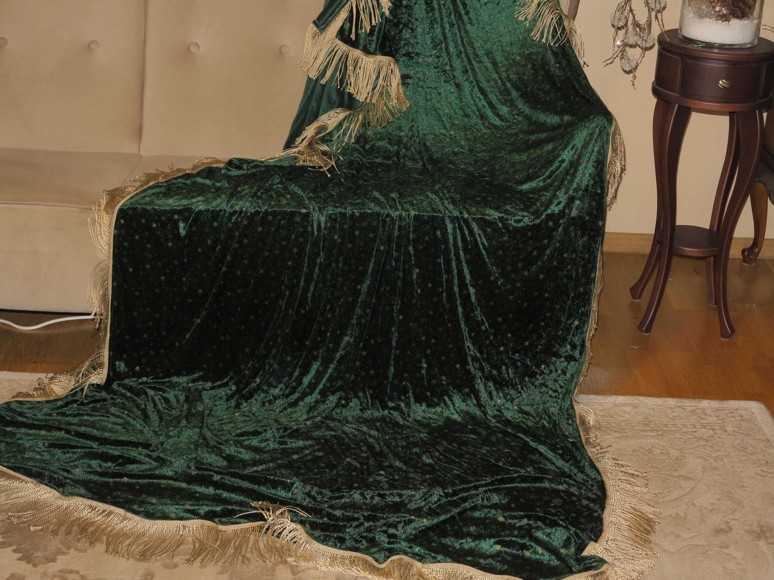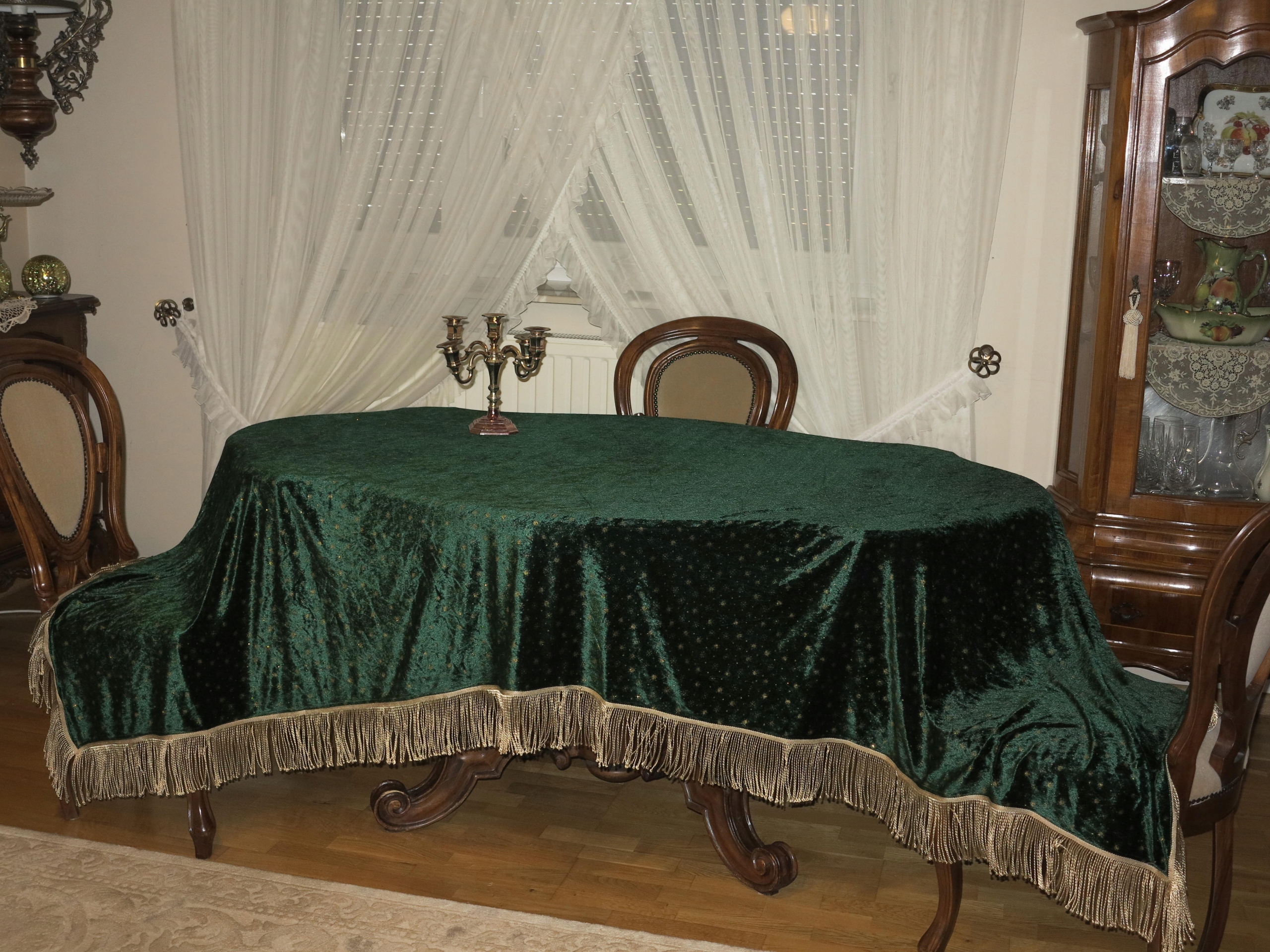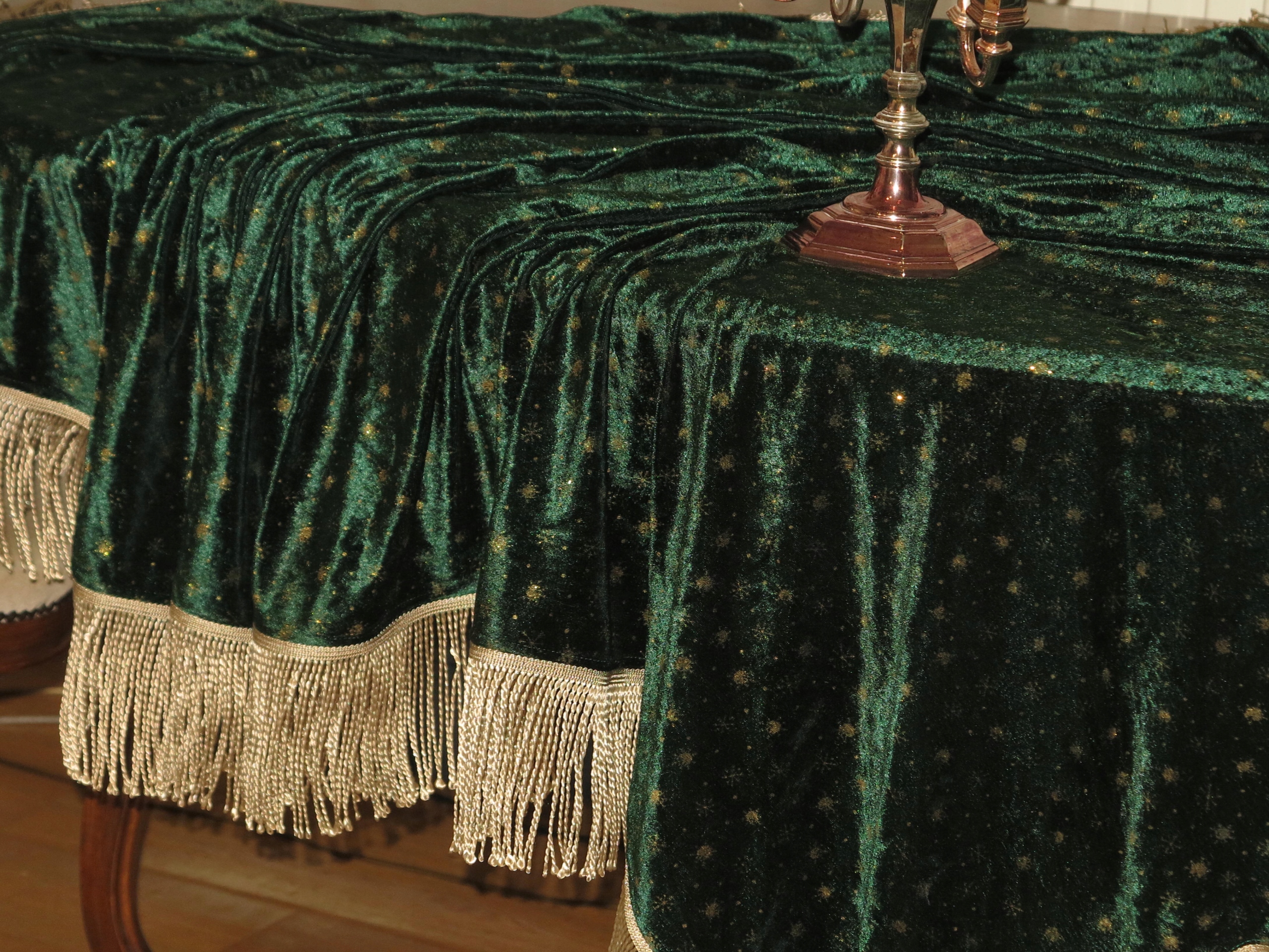 Елегантну величезну скатертину з м'ясистого оксамиту темно-смарагдово-зеленого кольору з золотими зірками. СКАТЕРТИНА, ПРИКРАШЕНА ДОВГИМИ ЗОЛОТИМИ БАХОМКАМИ.