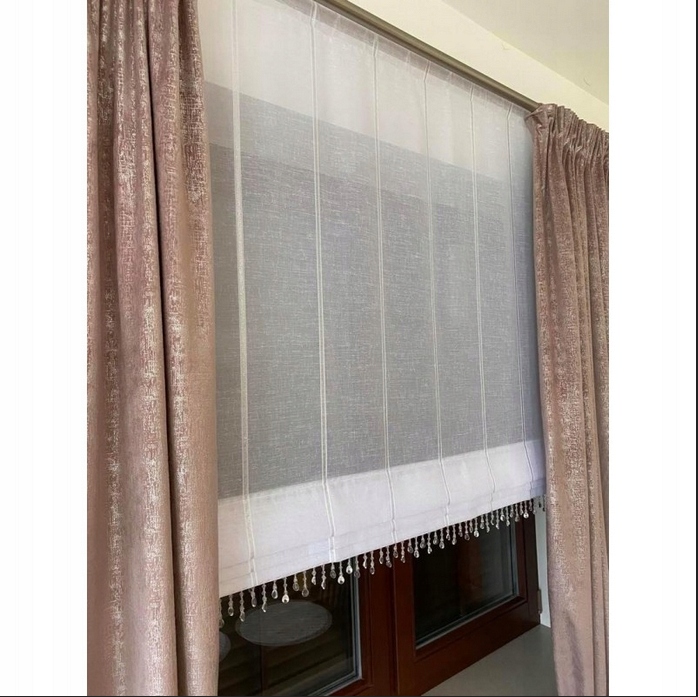 панель/імітація римських сліпих. Закінчено з трьома складками та білими, 3 см акриловими коралами. Панель підходить до всіх типів штор/завісів. Зроблено на прозорому рівному драконовому стрічці 5 см, що дозволяє повісити панель на жаб або тунель тунелю штор. Панель має вхід до жорстких стрижнів (смуги не додаються до сліпих). Тканина легко прасується і красиво розташована після повіслення.