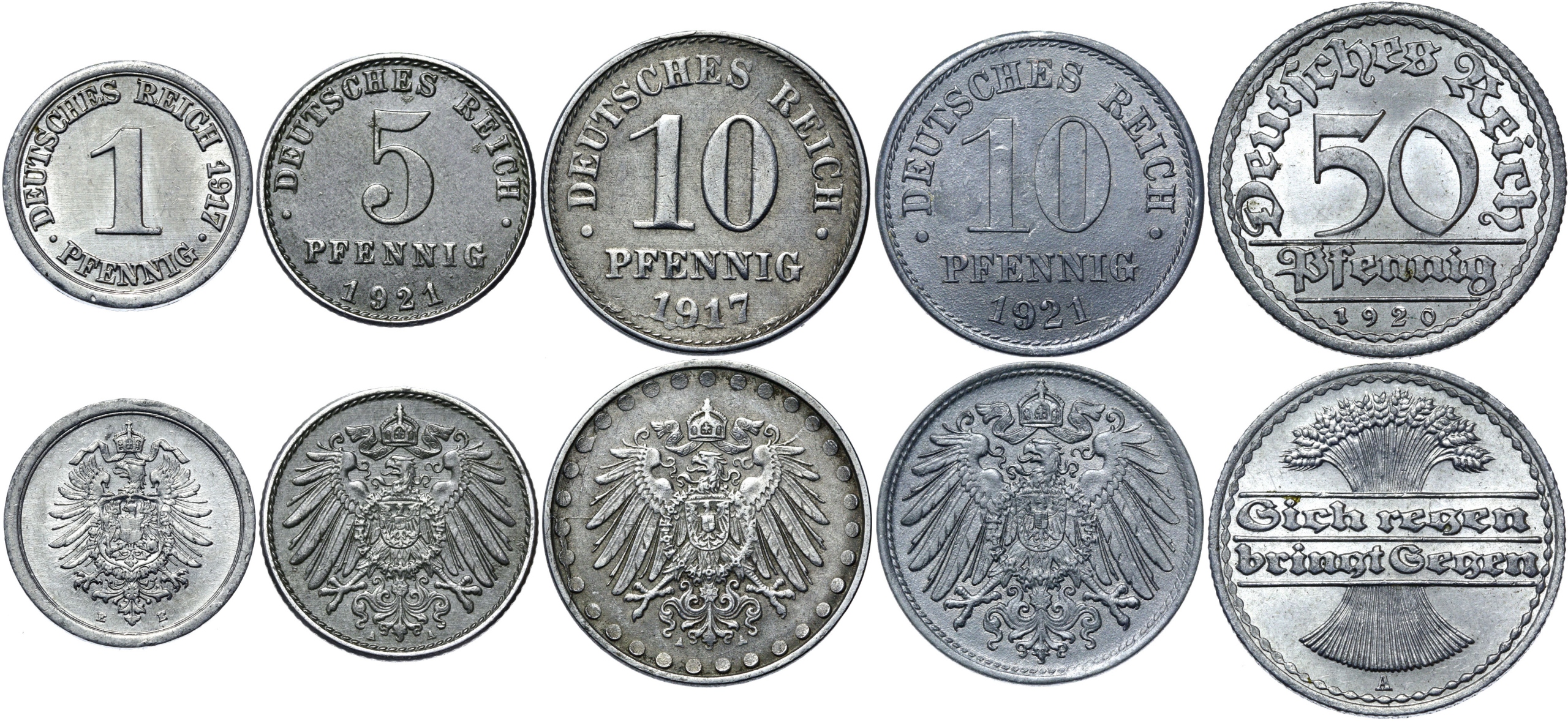 Набір довоєнних випусків монет 1, 5, 10 пфенігів, типи, викарбувані в 1915-1922 рр. (ВИКИДИ ПЕРШОЇ ВІЙНИ З ДЕШЕВШИХ МЕТАЛІВ) і 50 пфенігів 1919-1922 рр.