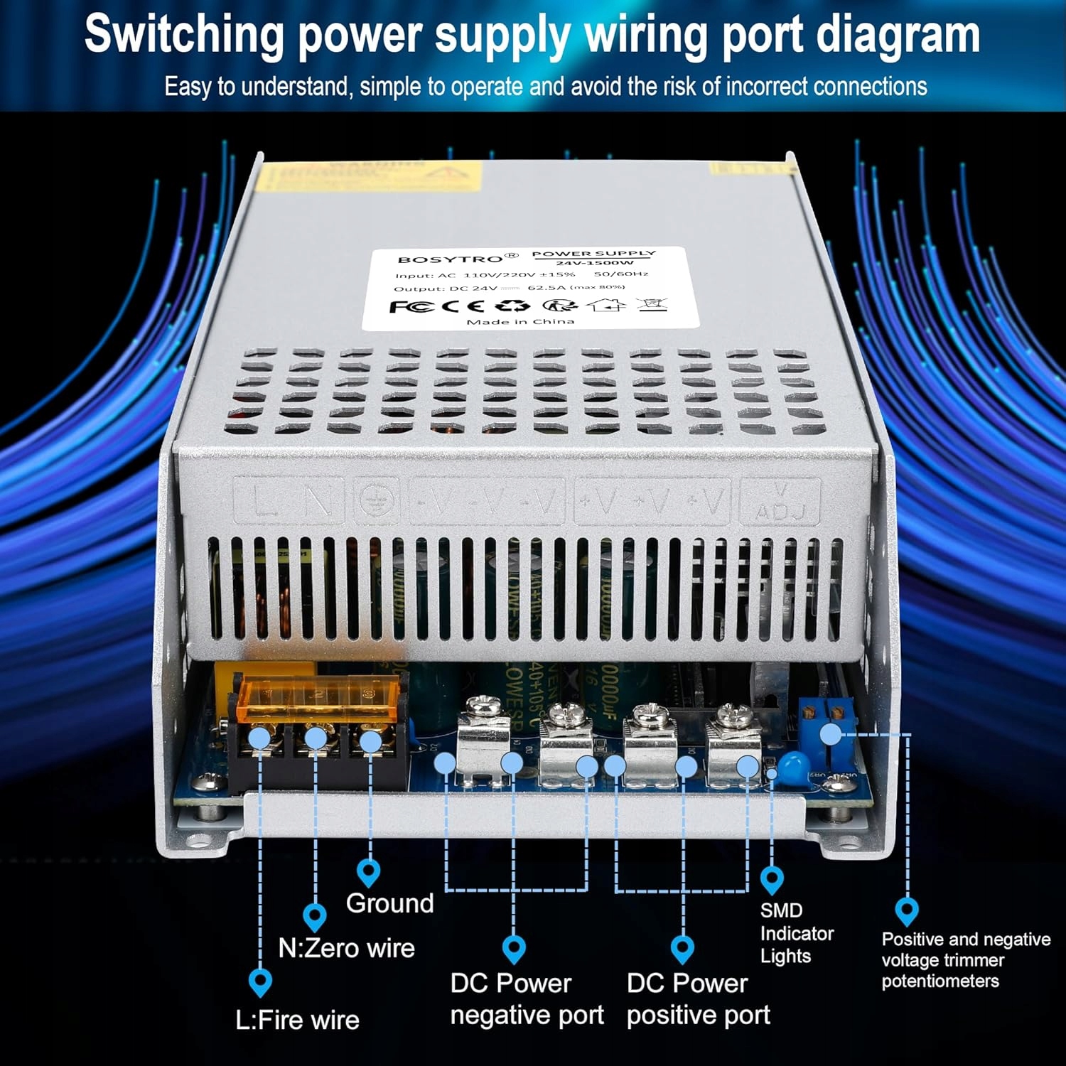 Імпульсне джерело живлення BOSYTRO 24 В 62,5 А 1500 Вт Універсальне імпульсне джерело живлення, AC110/220 -DC 24 В світлодіодне джерело живлення для відеоспостереження, світлодіодних стрічок, промислових комп’ютерних проектів