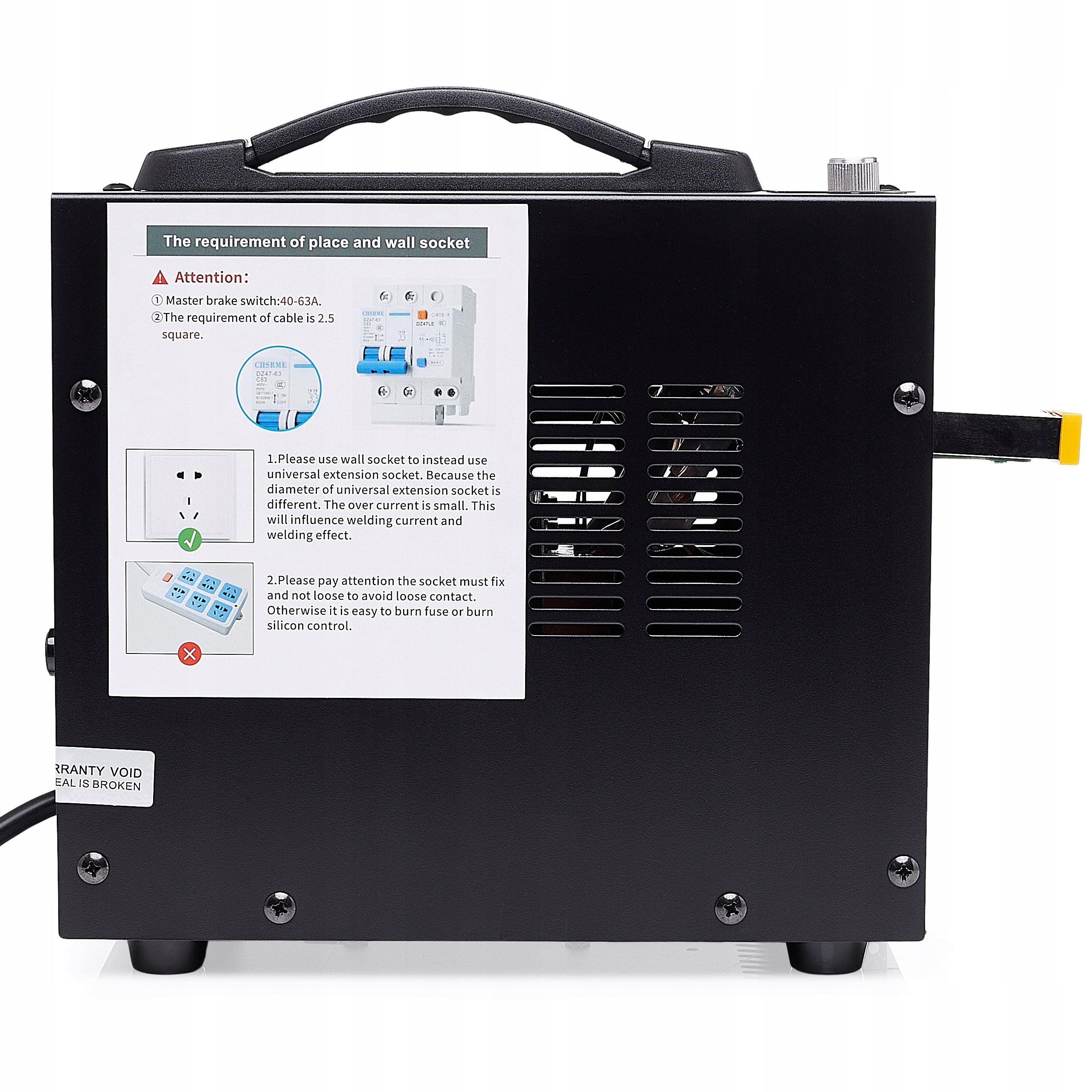 2. Через тимчасово високий зварювальний струм номінальний робочий струм вимикача струму має становити 40-63 А.