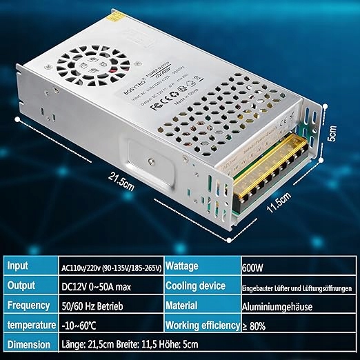 Імпульсне джерело живлення BOSYTRO 12 В 50 А 600 Вт постійного струму, універсальний регульований перемикач змінного струму 110 В/220 В (SMPS), джерело живлення 12 В для світлодіодної стрічки, система безпеки камер відеоспостереження, комп’ютерний дизайн