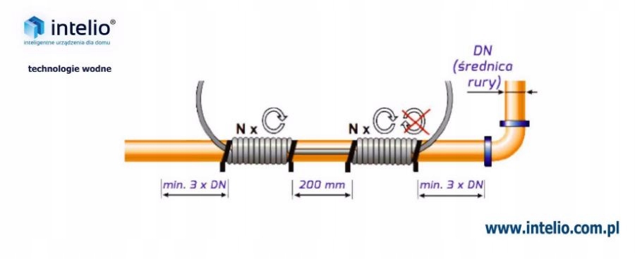 Увага! Котушки повинні бути розміщені на рівній частині трубопроводу та на достатній відстані від інших трубопроводів (лікті, трійники тощо). Мінімальна відстань повинна бути більше втричі перевищує зовнішній діаметр, на якому встановлено трубопровід. Якщо простір недоступний, дозволяється зменшити відстань між котушками до 100 мм. Однак довжина активного стовпця буде скорочена, завдяки якому пристрій активний. 4 DH: 14