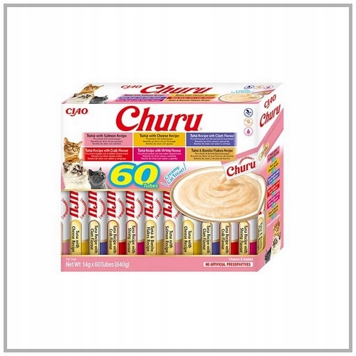 Тут ви знайдете беззернові вершкові ласощі Inaba Cat Churu для котів. Мікс делікатесів з тунцем - 60х14г.