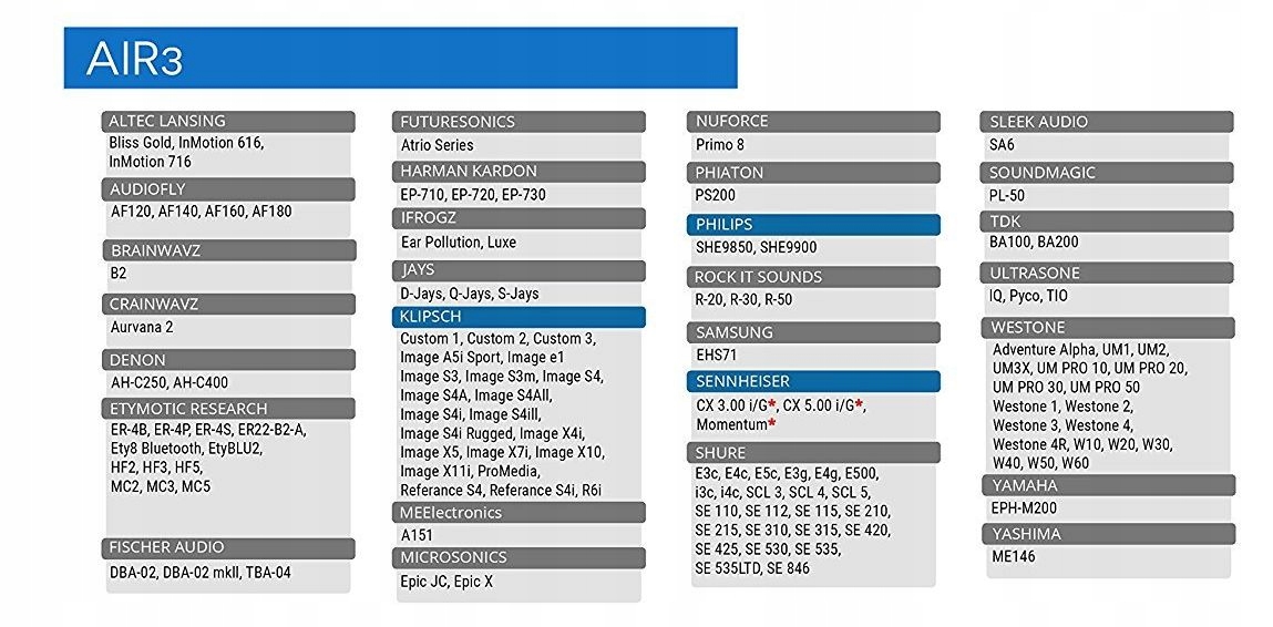 Піни INAIRS AIR 1 призначені для навушників із розміром рукава від 3,2 до 4,0 мм. Список популярних моделей навушників, з якими вони сумісні, можна знайти нижче або скориставшись пошуковою системою на веб-сайті виробника.