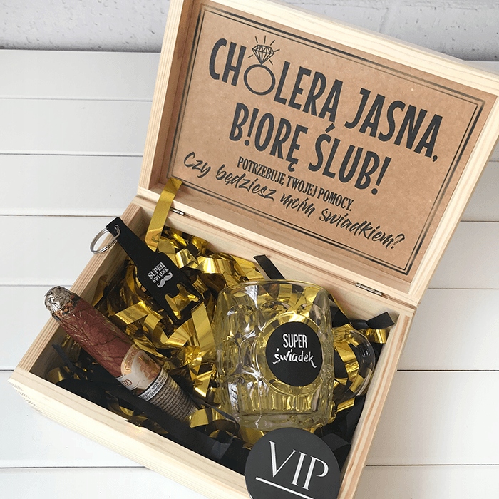 - Всередині чорно-золота коробка з подарунками для майбутнього свідка: оригінальна відкривачка для пива у формі плоскої пляшки з написом "супер свідок" прикрашений вусами, пивний кухоль також з принтом "супер свідок" " та елегантна сигара з нешкідливого для здоров'я шоколаду!
