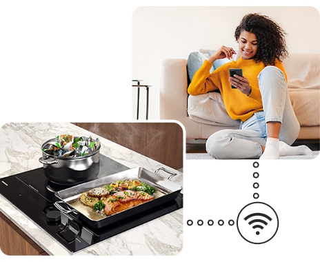 Насолоджуйтесь додатковою зручністю підключення Wi-Fi. Можливість стежити за варильною поверхнею в будь-який час і в будь-якому місці за допомогою програми SmartThings. Це дозволяє перевірити, чи активні поля, коли користувача немає вдома. Також можна дистанційно встановити таймер і отримувати сповіщення.