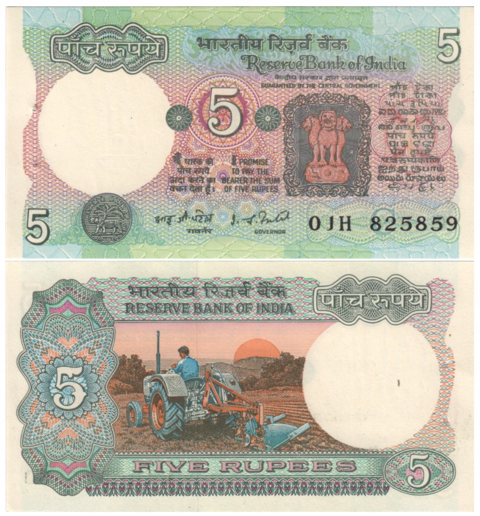 ІНДІЯ 5 РУПІЙ 1975–2002 P-80g UNC, отвори для скоб у банкноті, так упаковують банкноти в ІНДІЇ.