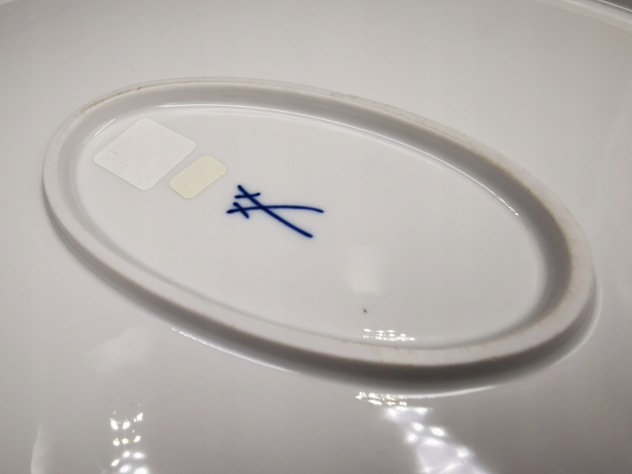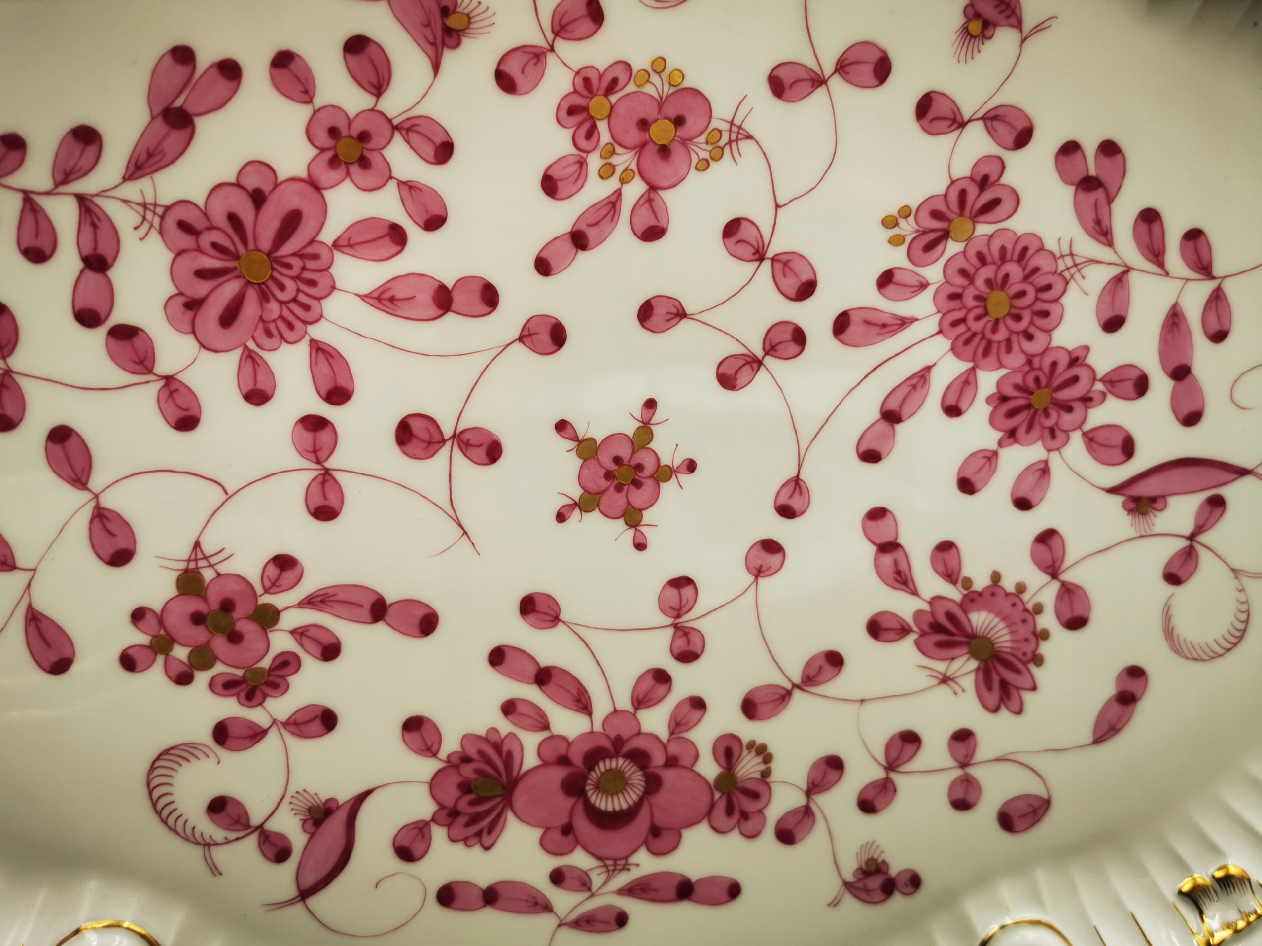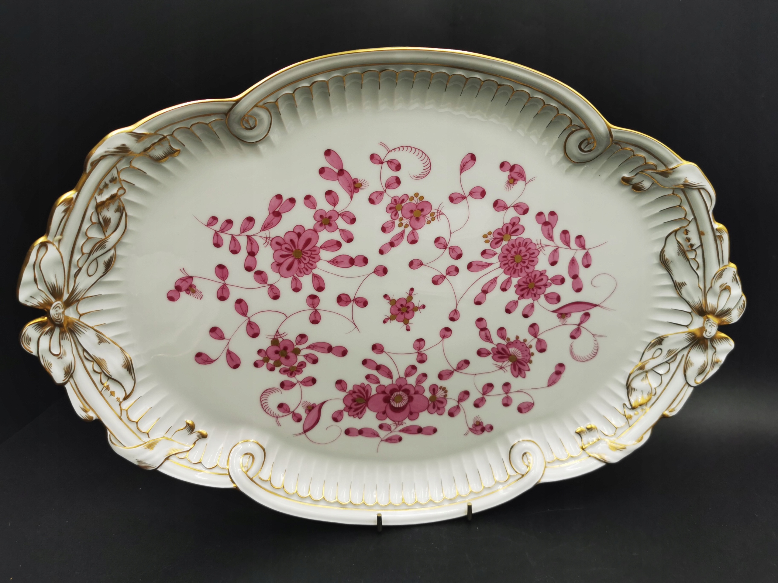 Предметом продажу є красива тарілка від порцелянового заводу світового класу в Мейсені. Тарілка з колекції з візерунком фіолетових індійських квітів. Тарілка підкуповує своєю надзвичайно декоративною формою, з елегантними рельєфними бантами на ручці та золотими вставками, що надають посудині надзвичайної елегантності. Посудина позначена візерунком із двох схрещених кобальтових шабель, що підтверджує її автентичність і походження з ХХ століття.
