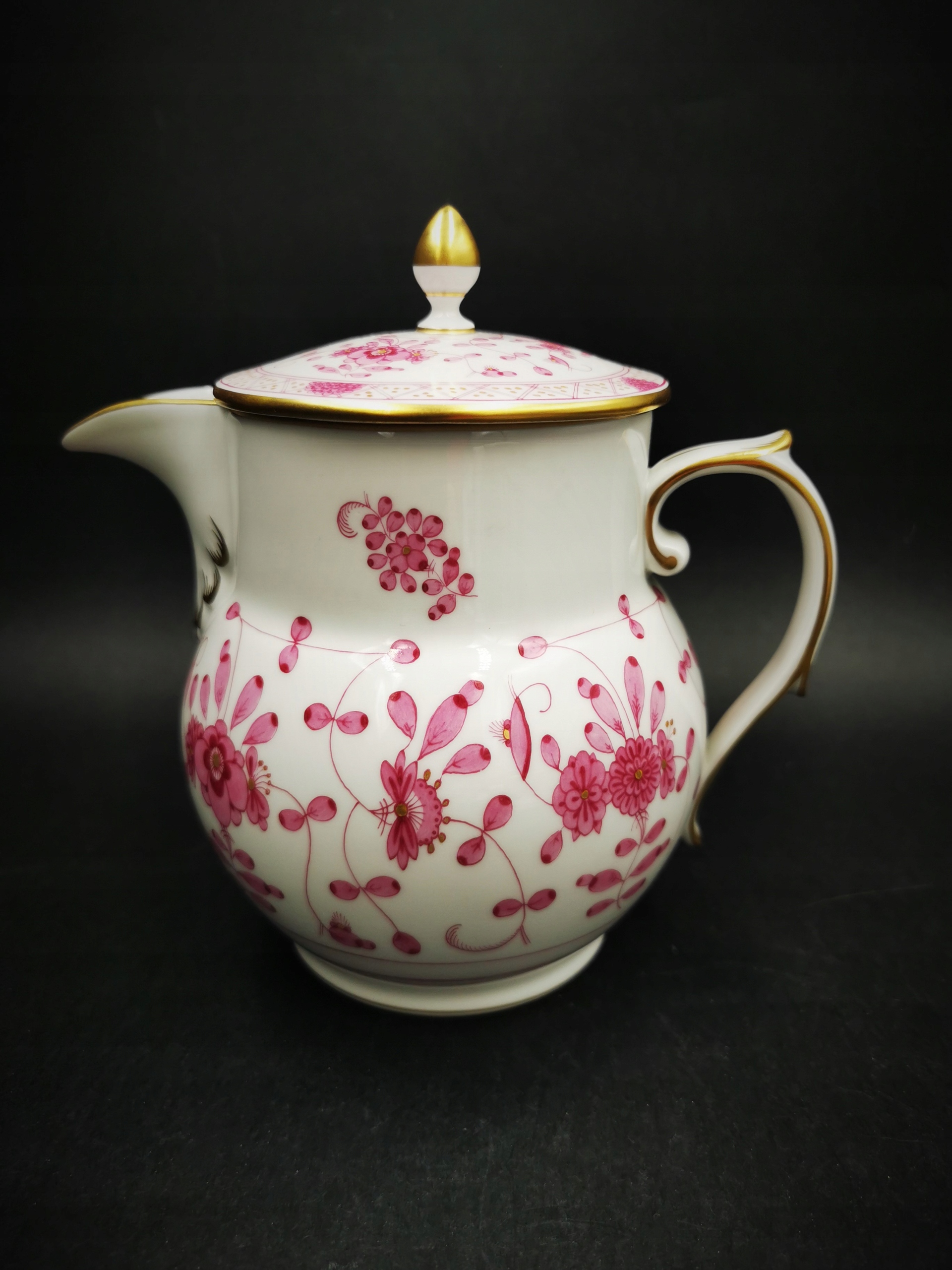 Представляємо чарівний чайник з чудової фабрики в Мейсені. Цей чудовий посуд належить до колекції Indian Flower і має оригінальний підпис у вигляді двох схрещених кобальтових шабель, що вказує на його походження в 20 столітті. Безперечна перевага, крім витончений рослинний декор пурпурного кольору, краї посудини, ручка кришки та глечика вкраплені золотом. Весь стан вважається дуже хорошим, і його варто рекомендувати кожному колекціонеру білого золота.