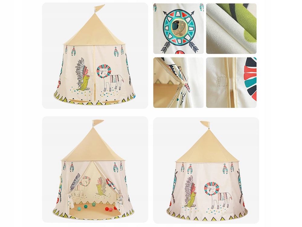 Дитячі намети для дому, такі як ігровий будиночок, палац, замок, вігвам або індіанське тіпі, є не лише фантастичним місцем для ігор, але й створюють надихаюче середовище, яке підтримує творчі здібності, уяву та розвиток дитини. Набір легко збирається і не займає багато місця в складеному вигляді. Його легко підтримувати в чистоті, що особливо важливо з маленькою дитиною. Набір упакований в естетичну упаковку на блискавці.