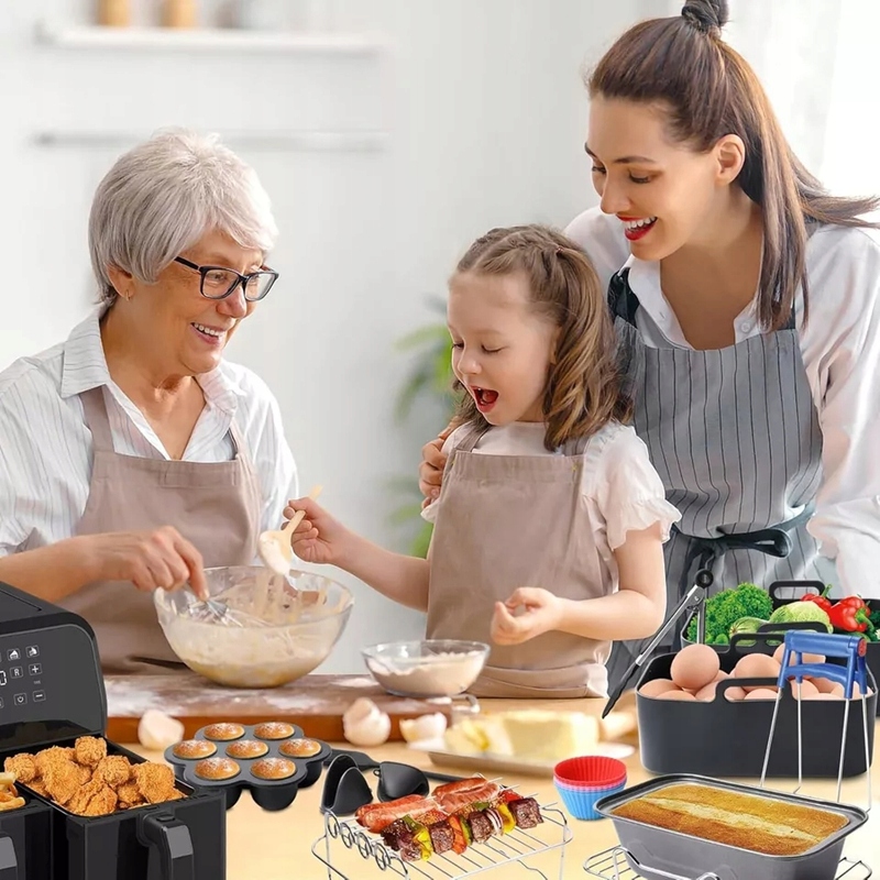 - Включає різноманітні вставки для кондитерських виробів, випічки та гриля, які перетворюють аерофритюрницю на повноцінну кухонну робочу станцію.