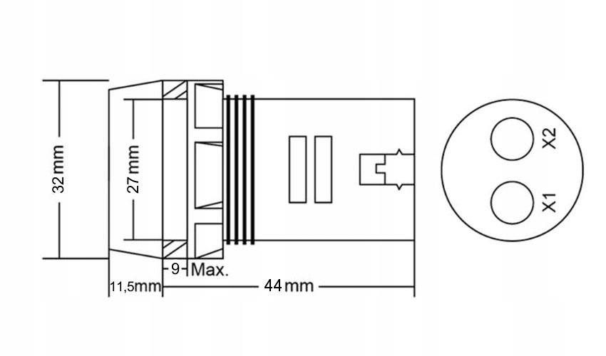 Світковий індикатор угвинчений у стандартний отвір діаметром 22 мм у форма амперметра / вольтметра / вимірювача частоти змінного струму, вбудованого в передню частину керування. Колір підсвічування підбирається під колір індикатора. Джерело змінного струму в діапазоні від 60 В до 500 В під’єднується дротами безпосередньо до гвинтових клем X1 і X2 у нижній частині індикатора.