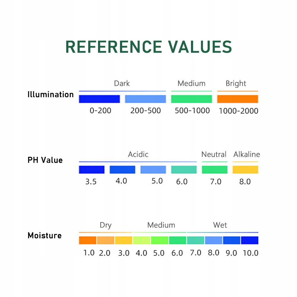 - 3 в 1 багатофункціональний тестер ґрунту: тестування світла/pH/вологості. Освітлення від 0 до 2000, PH від 8 до 3,5, вологість від 1 до 10.