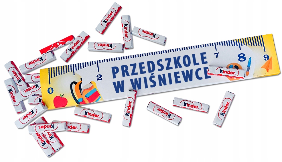 Представляємо унікальну індивідуальну лінійку-коробку для цукерок розміром 50х9 см. Це ідеальний вибір для випускних церемоній та інших випадків. Коробка може виконувати роль лінійки і водночас є естетичною упаковкою для цукерок чи інших невеликих подарунків. Завдяки можливості розміщення будь-якого напису, це ідеальний спосіб створити унікальний подарунок, який вирізнятиметься своєю оригінальністю. Упаковка імітує зовнішній вигляд лінійки, що символізує школу та навчання, що ідеально відповідає темі студентства. Він вміщує до 24 шоколадних цукерок Kinder, але також ідеально підходить для пакування інших солодощів.