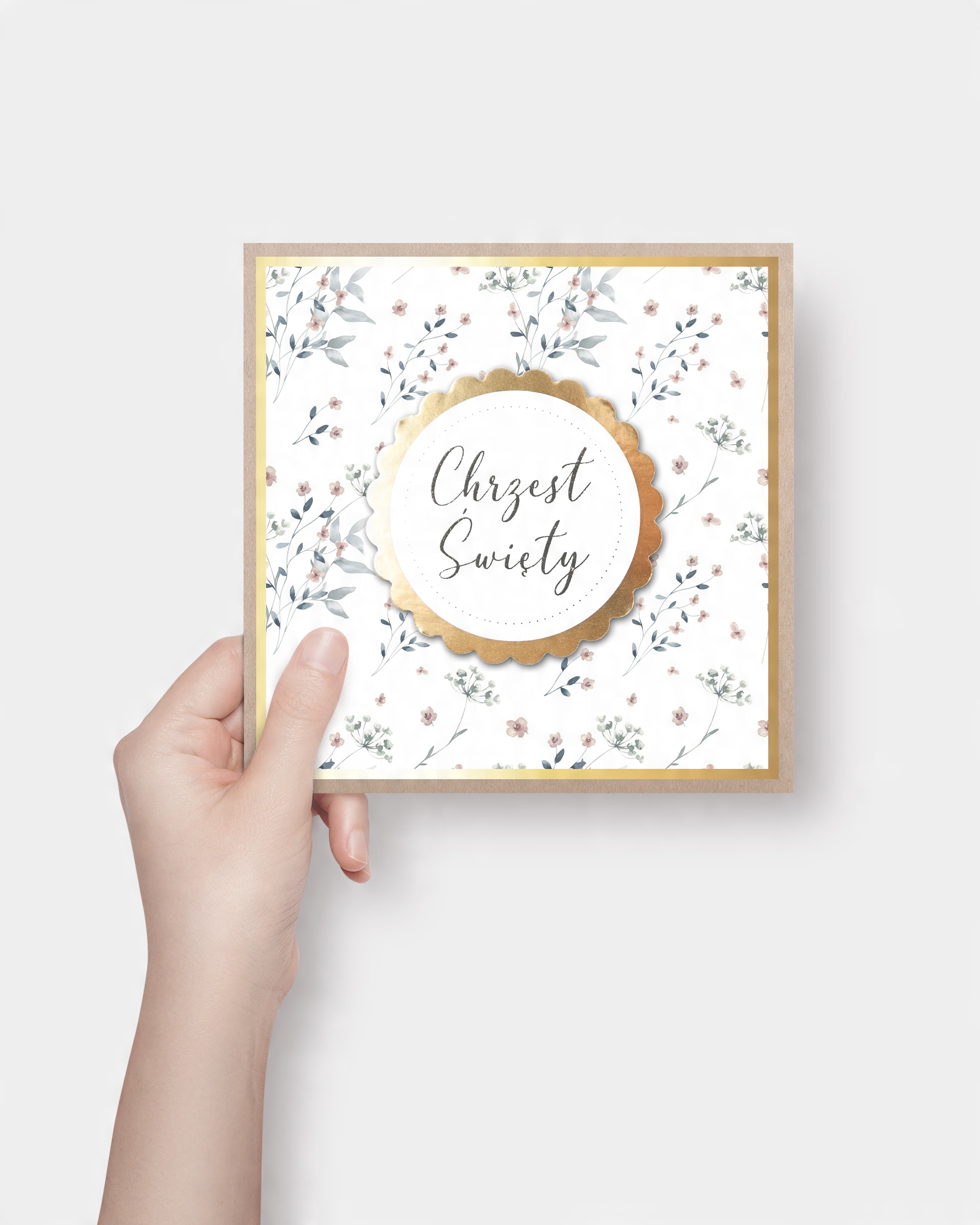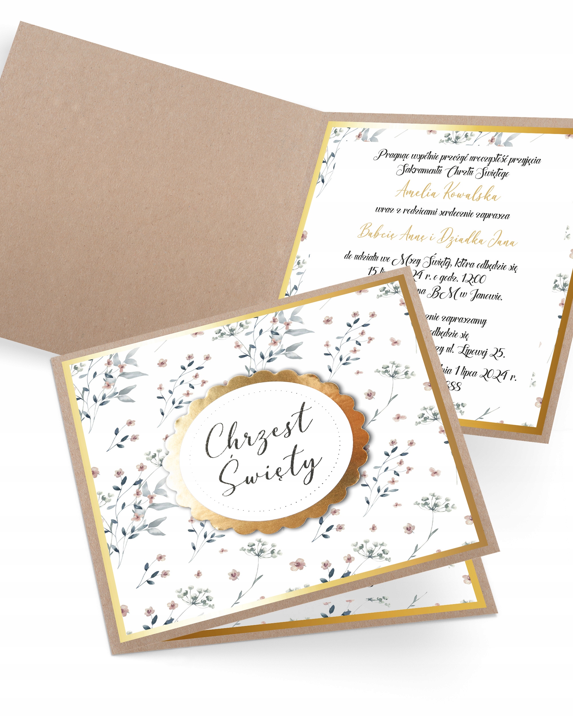 "Fine Pattern Gold" - це надзвичайне запрошення на хрещення, де витонченість поєднується з елегантністю. Ніжний квітковий візерунок у поєднанні з елементами з позолоченого паперу створюють вишукану композицію. Вся справа виготовлена на екологічно чистому еко-папері. Це не тільки оголошення про важливу подію, але й невеликий витвір мистецтва, який випромінює стиль і клас. "Fine Pattern Gold" - це запрошення, яке не тільки порадує гостей, але й приємно передуватиме церемонії Хрещення.