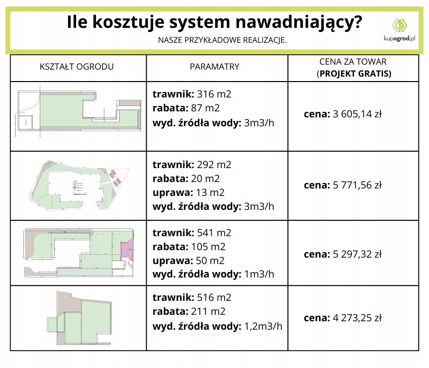 - Розмір саду - чим більше поливу, тим більше елементів зрошення , чим більша ефективність, тим менше, що потрібно використовувати. Сад - Складне розташування доріжок або куточків може вплинути на необхідність використання більшої кількості компонентів. Вибірка оцінок зрошувальних систем у різних садах. Ціни є приблизними і можуть змінюватися залежно від індивідуальних умов ділянки та потреб клієнтів. Ми повертаємо його вартість у придбаних товарів. Завдяки цьому ви можете бути впевнені, що система буде точно пристосована до вашого саду, і ви не несете додаткових витрат.