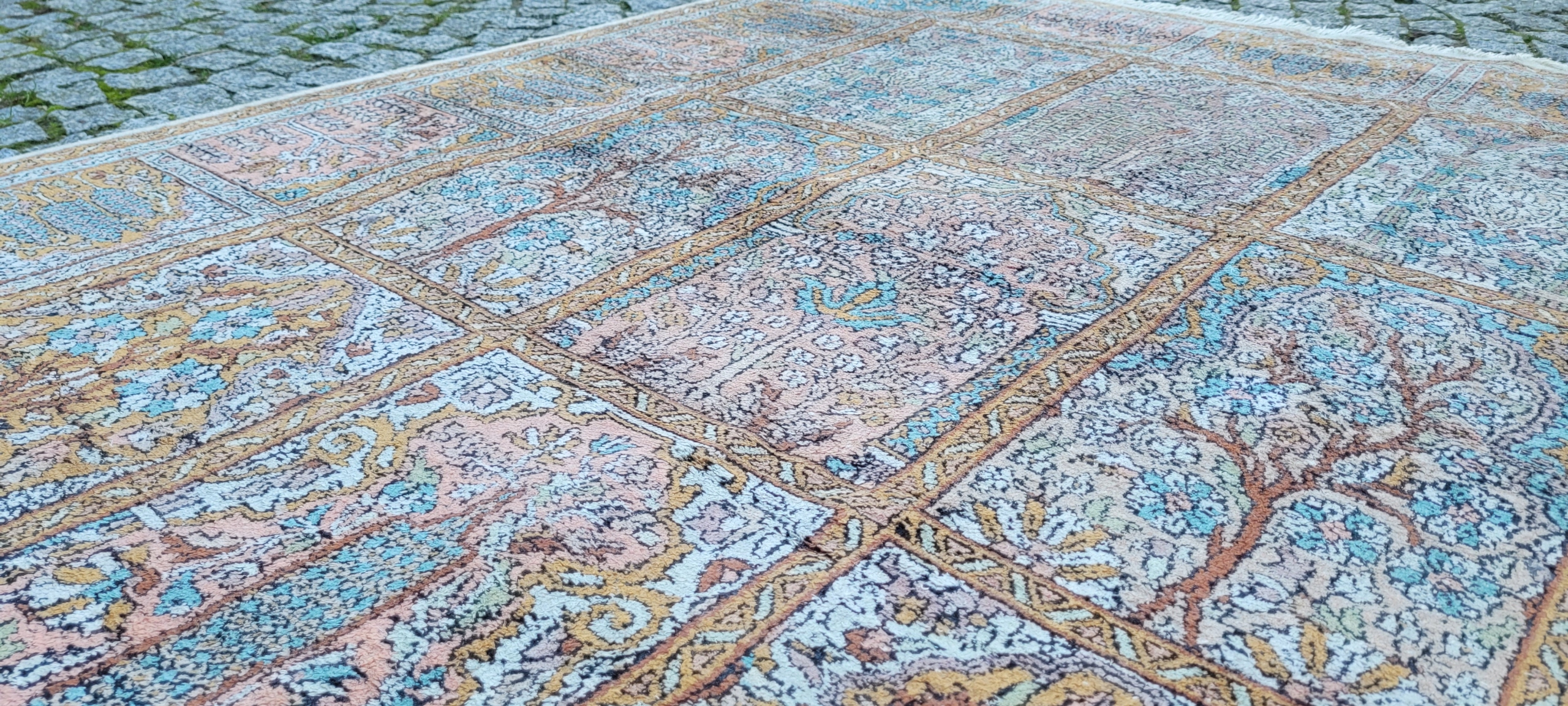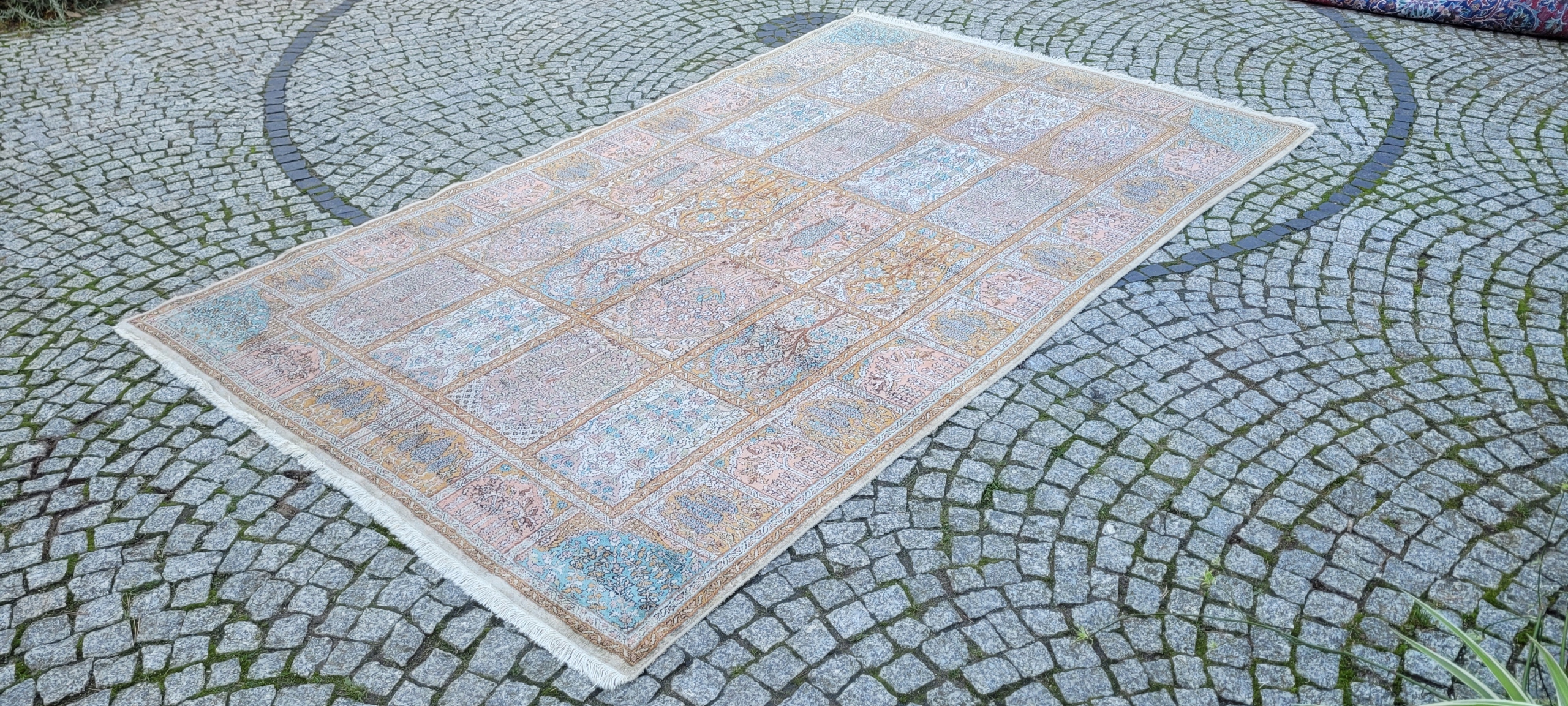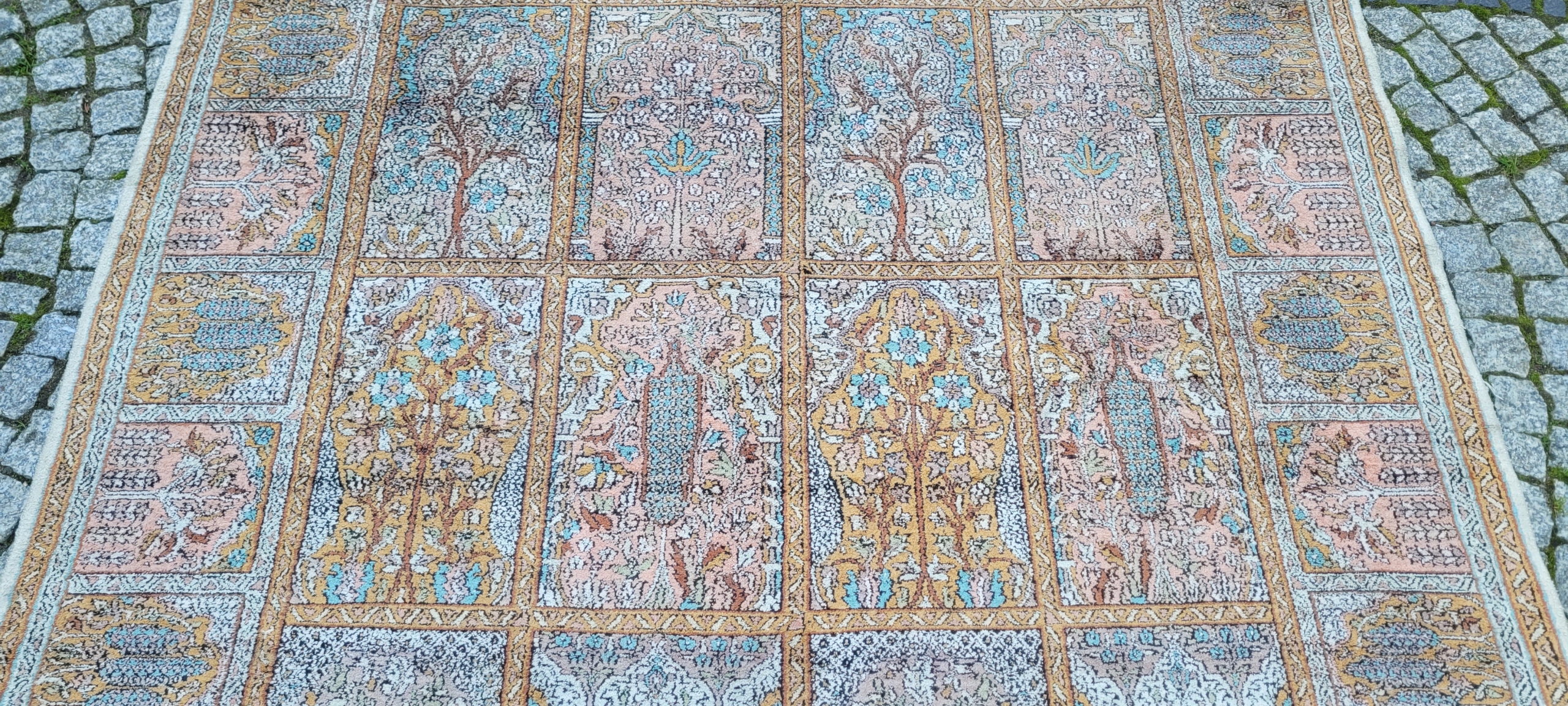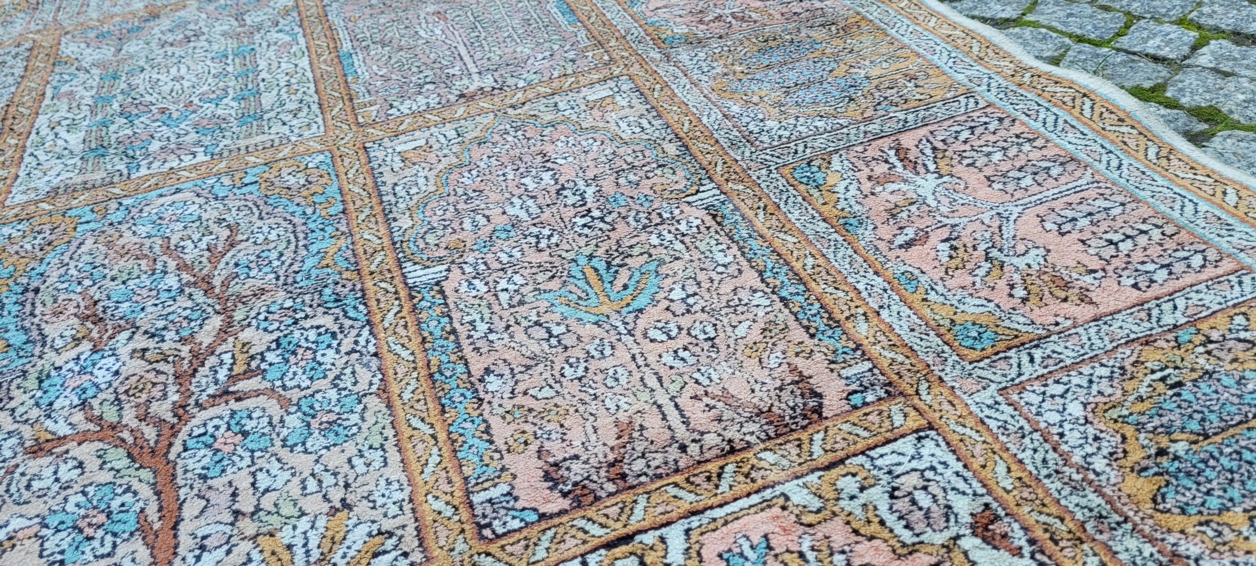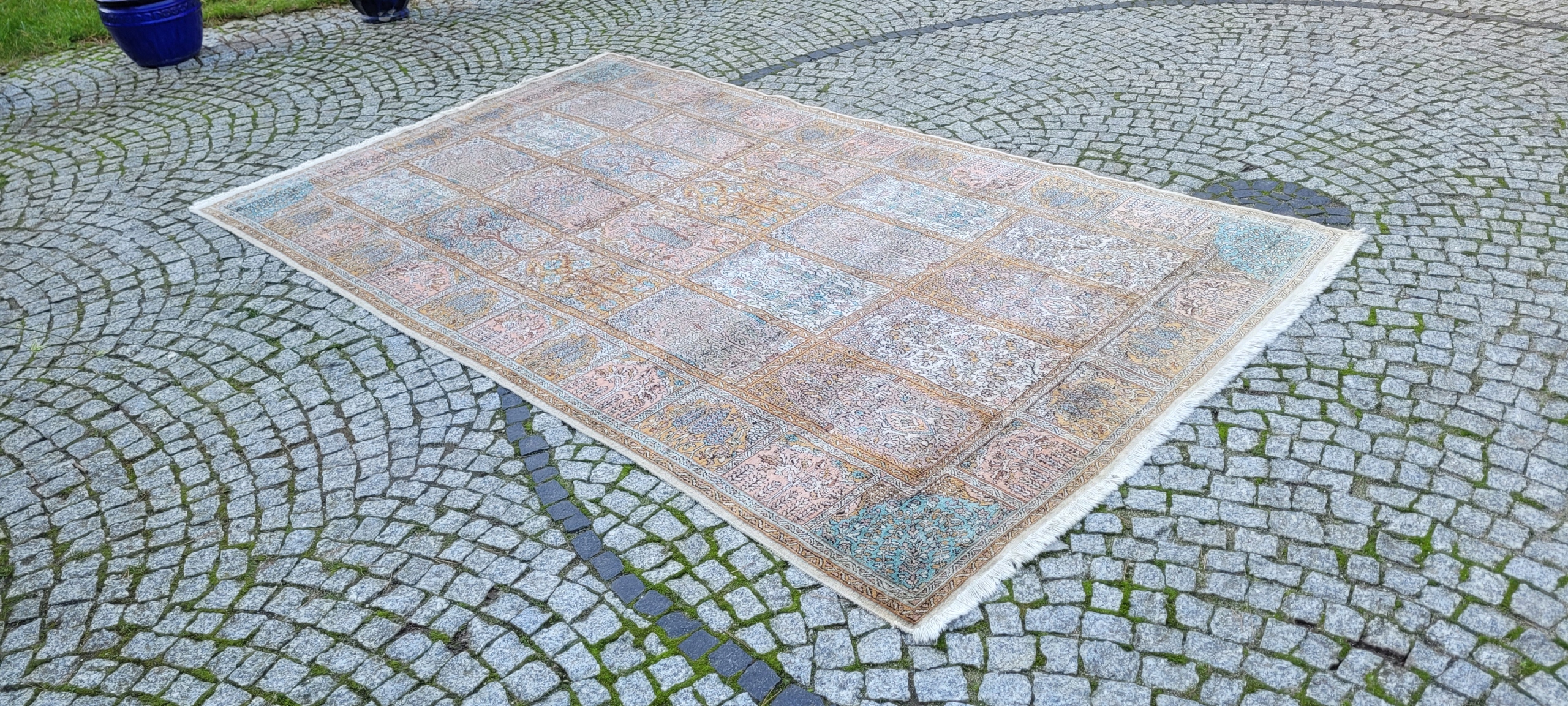 Індійський килим Ghom. Ручне виткання з шовку. Характеризується компактним, приємним на дотик, блискучим флісом і красивими кольорами та візерунками. У хорошому стані, видно на фото.