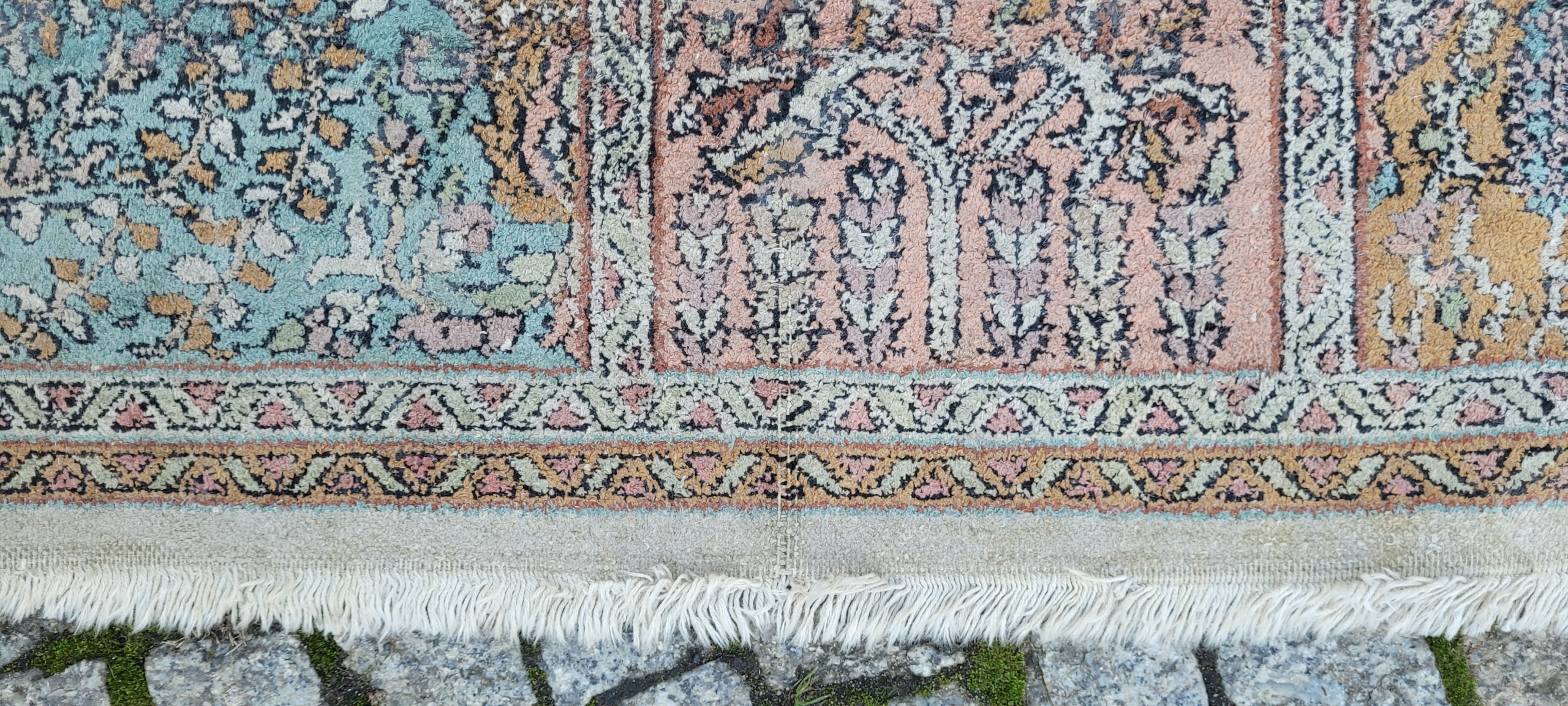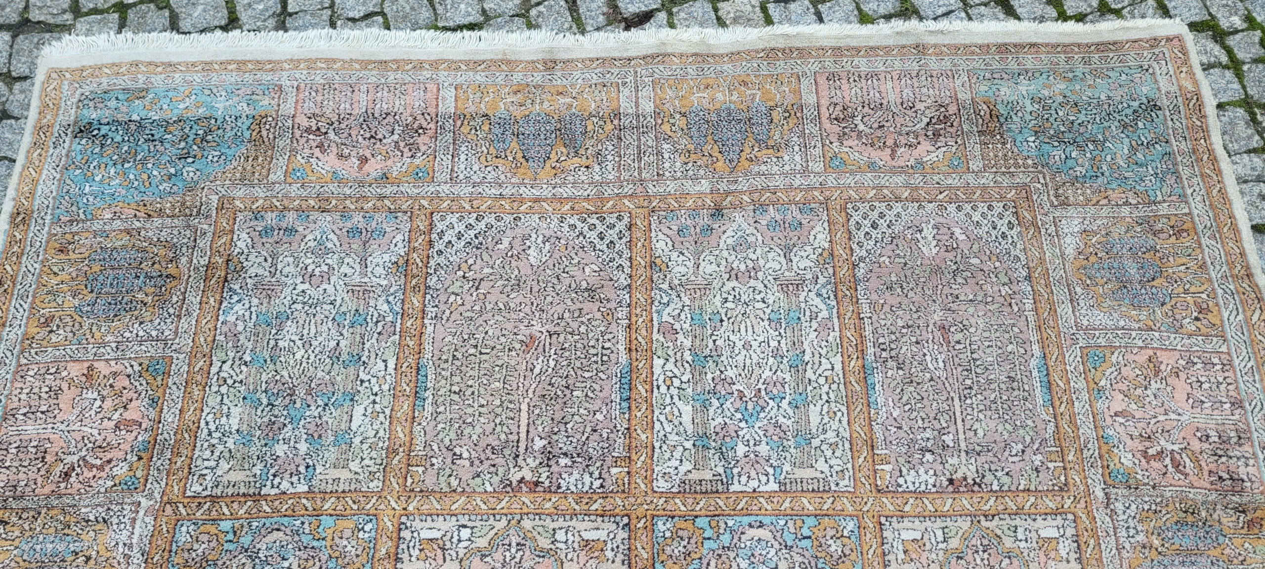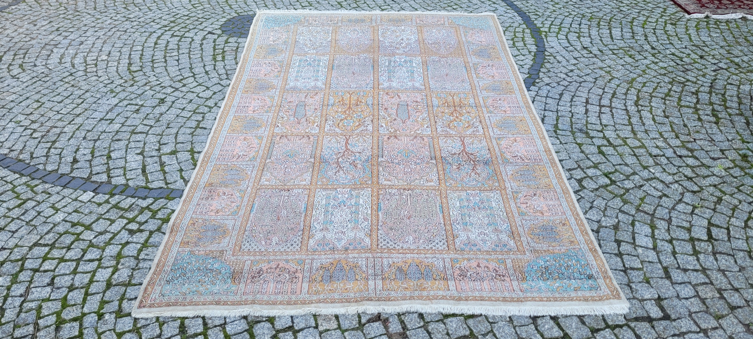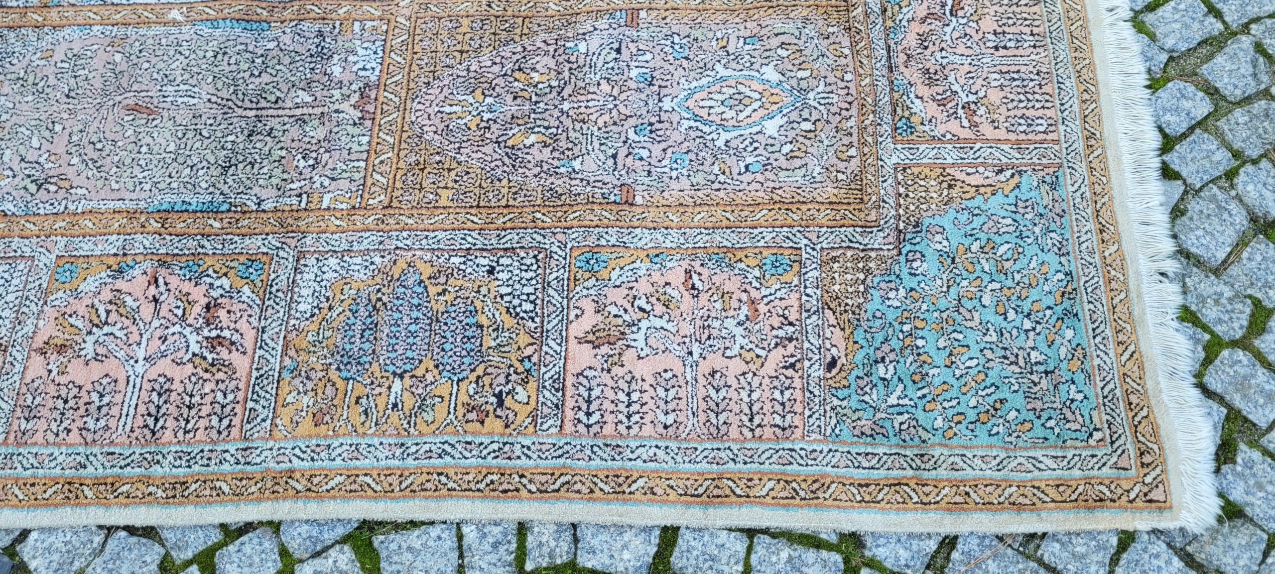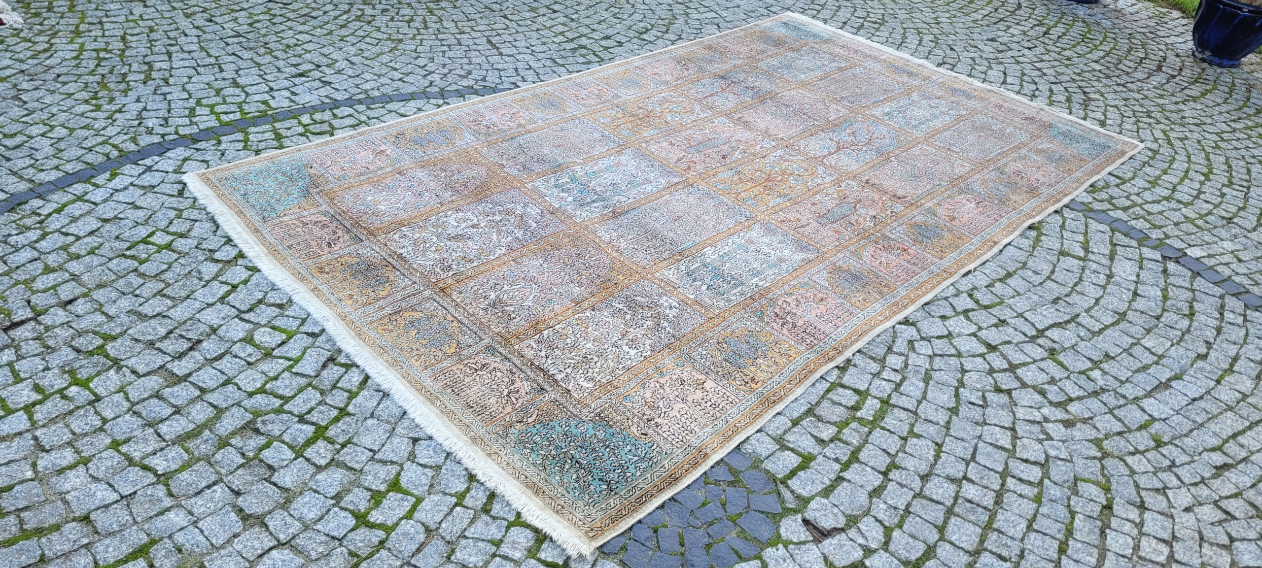 Індійський килим Ghom. Ручне виткання з шовку. Характеризується компактним, приємним на дотик, блискучим флісом і красивими кольорами та візерунками. У хорошому стані, видно на фото.