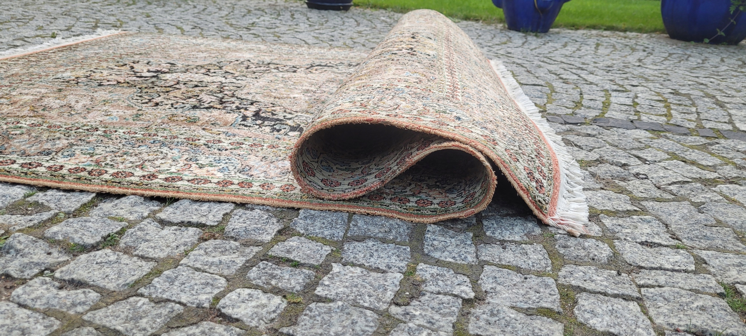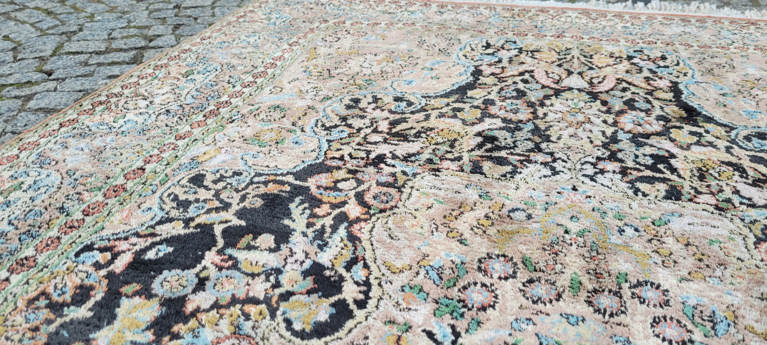 Індійський килим Ghom. Ручне виткання з шовку. Характеризується компактним, приємним на дотик, блискучим флісом і красивими кольорами та візерунками. В дуже хорошому стані з мінусом, видно на фото. Дефекти в кутах.