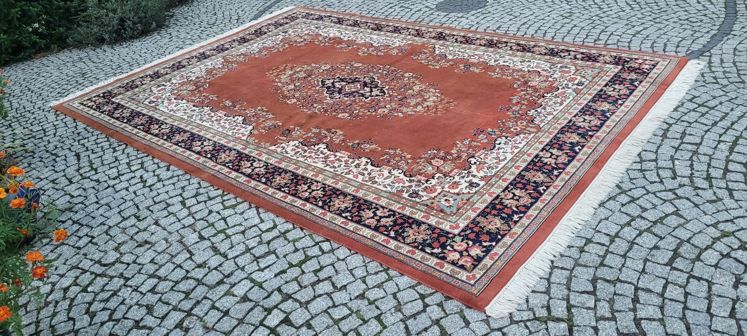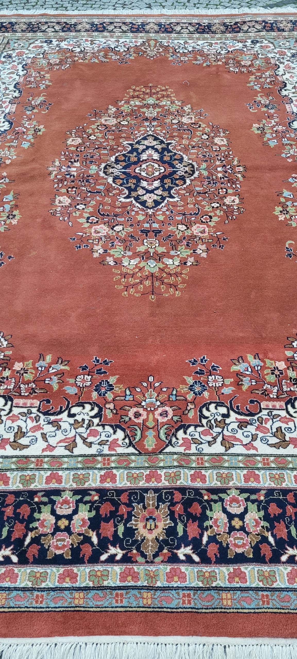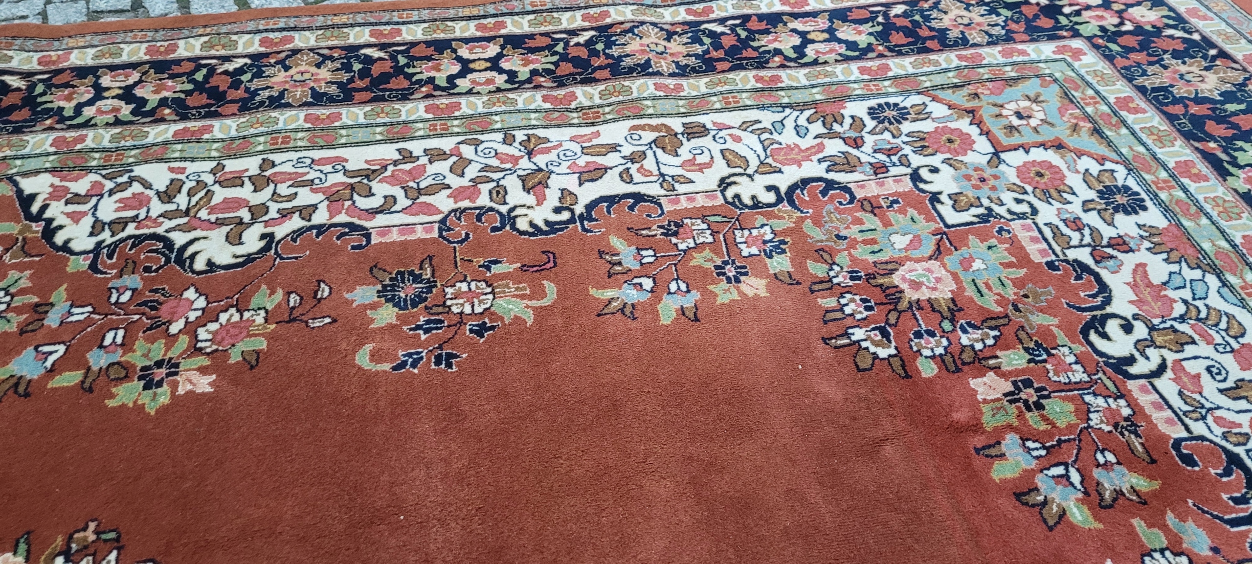 Прекрасний індійський килим Керман. Виткана вручну з вовни найвищої якості. Характеризується компактним, приємним на дотик, блискучим флісом і красивими кольорами та візерунками. Він досить м'який, але надзвичайно компактний і важкий. Зберігся в дуже хорошому стані. Тіні, які видно на фотографіях, є результатом розташування флісу.