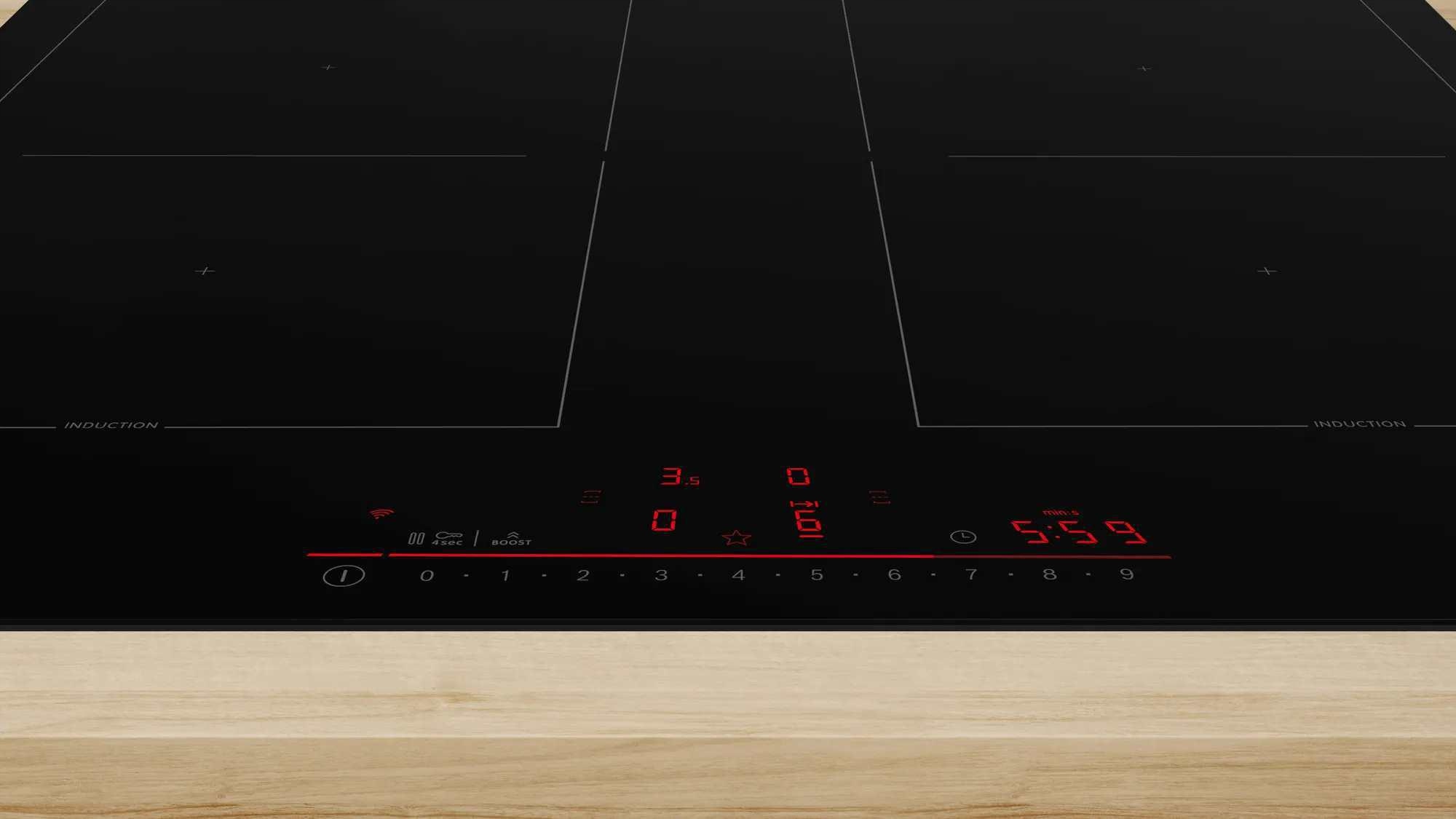 - Additional functions: Parental blockage, residual heat, maintenance of heat, smartphone control, sound signal, fast heating, timer, combining heating fields PowerBoost