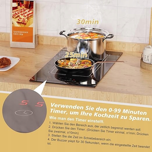 - Кілька кухонних функційдля ваших повсякденних кухонних потреб: зона нагрівання над індукційною варильною поверхнею з 2 конфорками оснащена функцією Boost із потужністю до 2000 Вт. Завдяки 9 рівням потужності ви можете легко збільшити або зменшити кількість калорій до потрібного рівня. Ви можете встановити інтелектуальний таймер для обох конфорок одночасно, залишаючи руки вільними