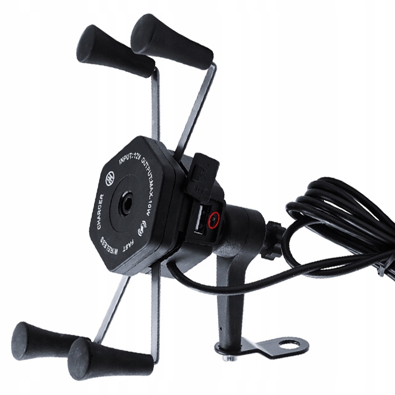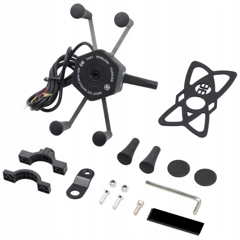- тримач X-типу з 4 кронштейнами з гумовими захватами, індукційний зарядний пристрій QI, зарядний пристрій USB, перемикач і кабель