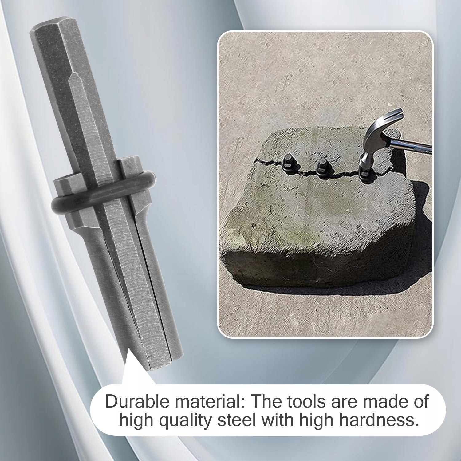 Розколювання без піскоструминної обробки: клини для розколювання каменів використовуються для розколювання великих твердих каменів без піскоструминної обробки. Може використовуватися для кам'яних матеріалів, таких як граніт, мармур і бетон. Каміння до 2 метрів: кам'яний клин може розколювати каміння розміром до 2 метрів. Розмістіть каменеріз з інтервалом 15-25. Отвір повинен мати діаметр 16 мм і глибину 50 мм. Міцний матеріал: інструменти виготовлені з високоякісної сталі високої твердості. Технічні дані: Колір: чорний Розмір: 10,5 × 1,6 см Матеріал: хром/ванадієва легована сталь У комплект входить: 5 × кам’яних клинів, що розбивають скелі